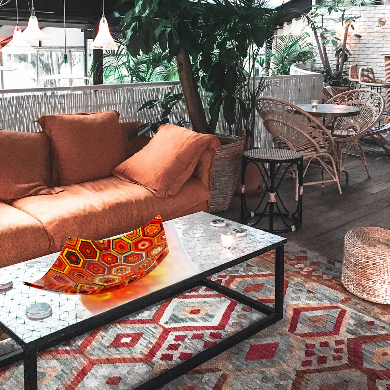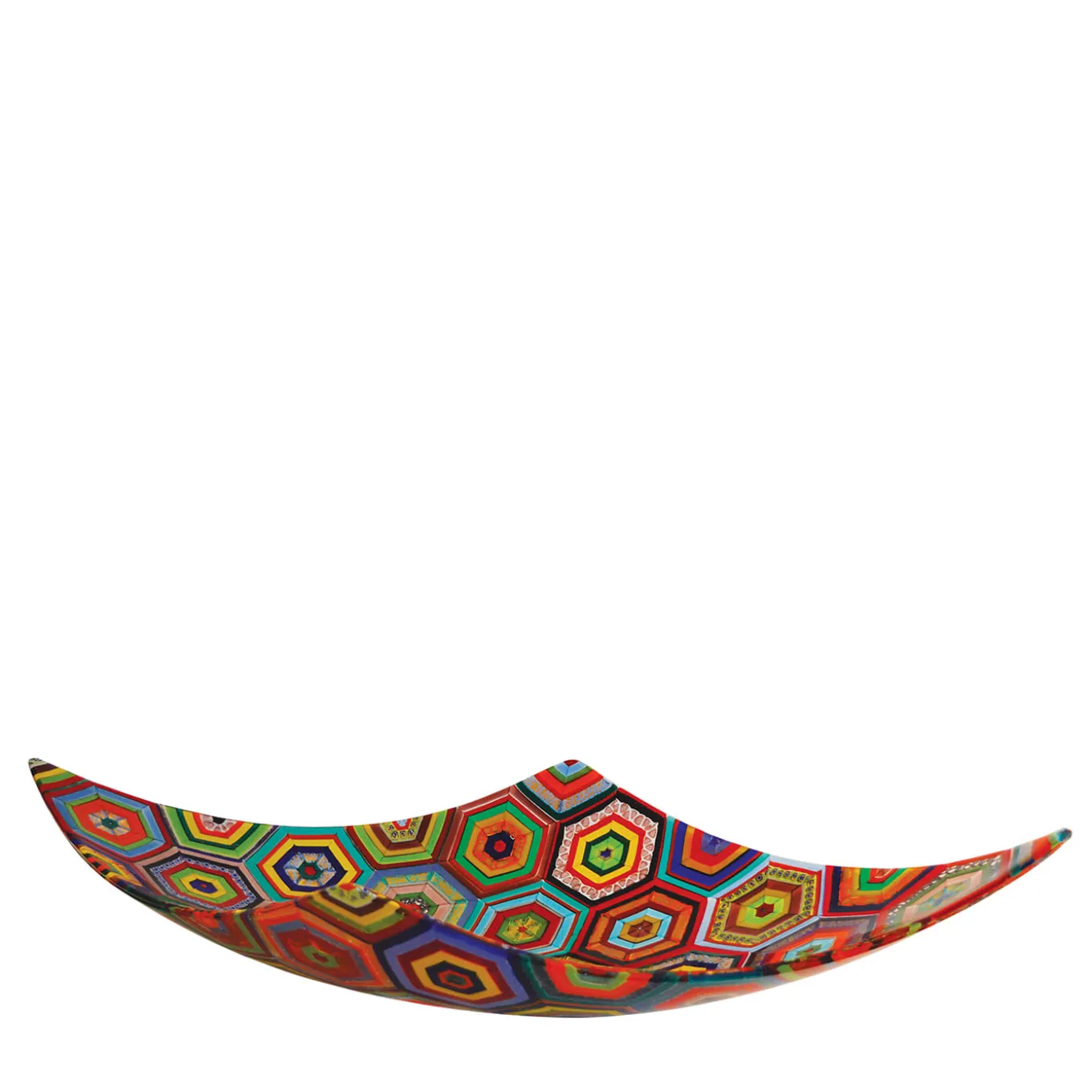 The timeless luxury imbuing all Murano glass masterpieces makes no exception in this superb centerpiece bowl. Shaped like a rhombus, the hypnotizing pattern of polychrome hexagons – evocative of stunning handpainted majolica tiles – is enriched with gold leaf and murrina accents for enhanced visual appeal. The generous size suggests it as an eye-catching complement piece suiting refined hospitality or contract contexts.