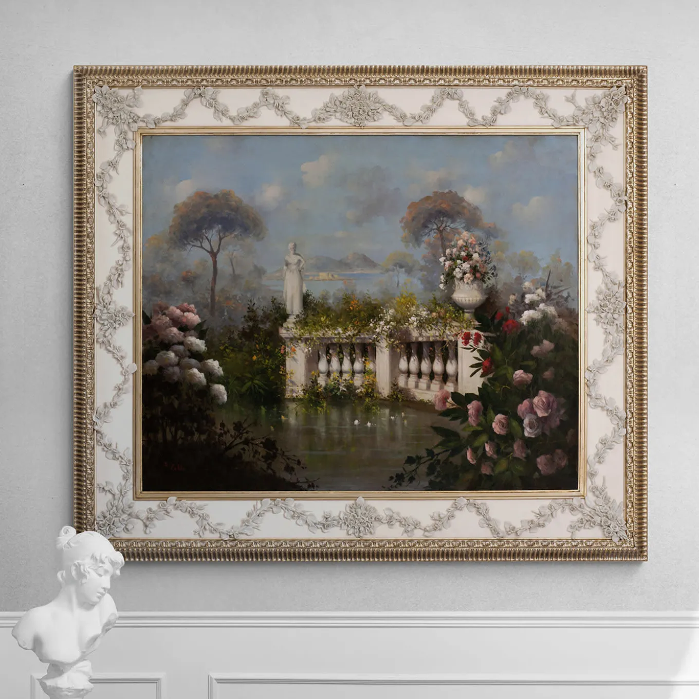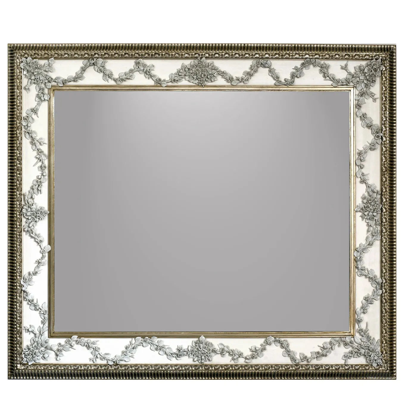This medium-sized wall mirror features an elegant frame finished with genuine silver leaf, subtly antiqued to evoke a warm, golden hue. The white matte lacquered inner surface highlights a delicate garland of porcelain roses and rosebuds, each sculpted with intricate detail and applied by hand. The refined floral decoration adds a romantic touch, making the mirror suitable for classic or romantic interiors. Custom sizes and layouts are available upon request. Please contact the Concierge for more information.