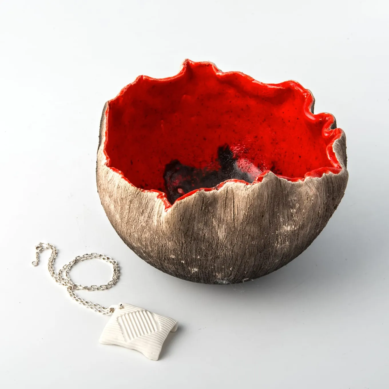 The Rosso di Sera decorative ceramic bowl is a striking centerpiece that elevates any interior space. Characterized by its irregular rim and a matte graphite-black exterior, this piece showcases a vibrant interior finished in fiery red with silver accents. Carefully crafted using the raku technique, this unique bowl exemplifies the artistry of fine ceramics. Each bowl is packaged in a sleek blue cardboard box and includes a warranty certificate along with care instructions, ensuring a luxurious presentation and lasting quality. This piece is a testament to exquisite craftsmanship and artistic expression in home décor.