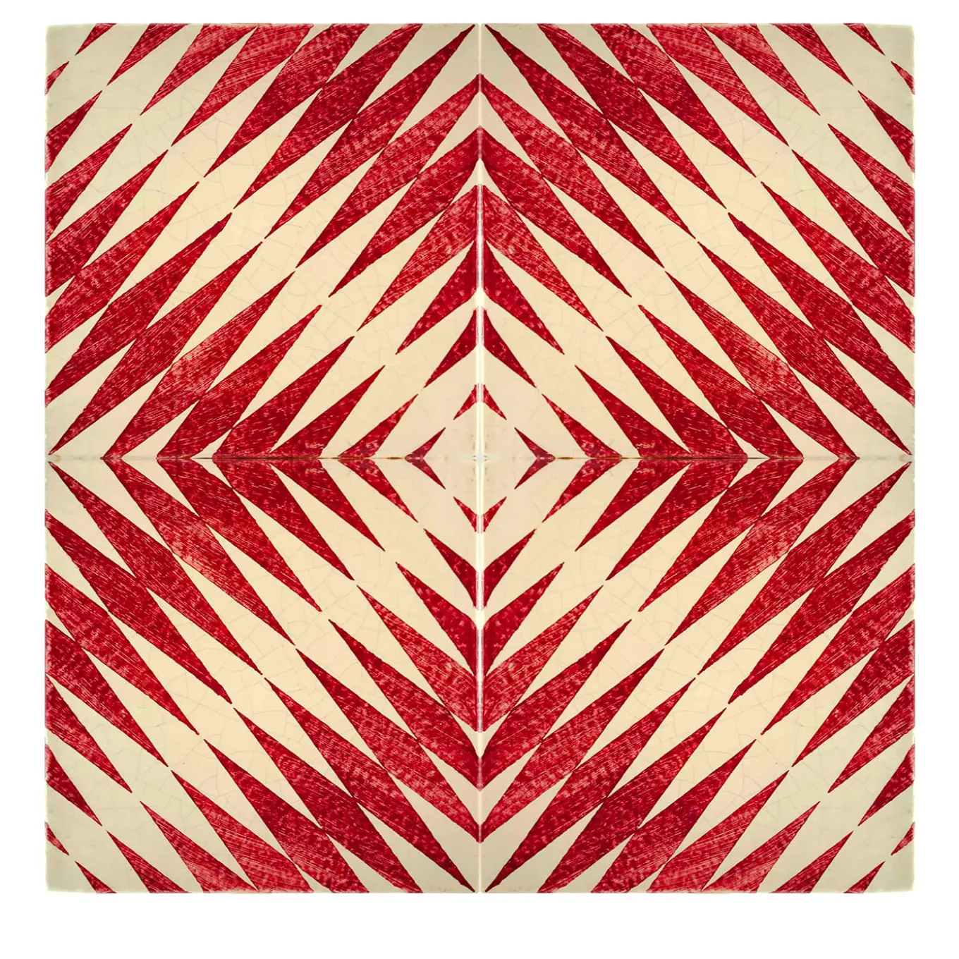 Deeply rooted in artistic traditions, this Moorish-inspired tile is poetically rendered by the master artisans at Studio Le Nid, a historic Sicilian workshop specialized in majolica ceramic. Completely handmade and glazed, this tile boasts an elongated diamond-shaped motif in an ivory-hue which emerges from the vibrant red background. This juxtaposition of colors and forms reveals a larger diamond-shaped form resembling the mirrored forms in a kaleidoscope. Suitable in a kitchen, bathroom, or poolside patio, this tile must be applied with minimal grouting to ensure design continuity.