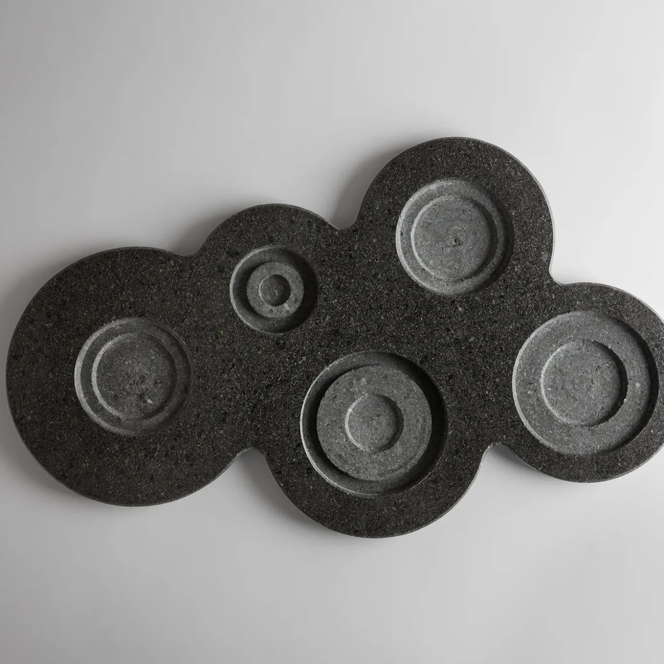 This modern and elegant candle holder is made of black lava stone, its silhouette formed by five juxtaposed circles of different sizer. The sinuous design features five concave lodgings for candles of various diameters. The piece is also offered in white Carrara marble, please ask the Concierge for details.