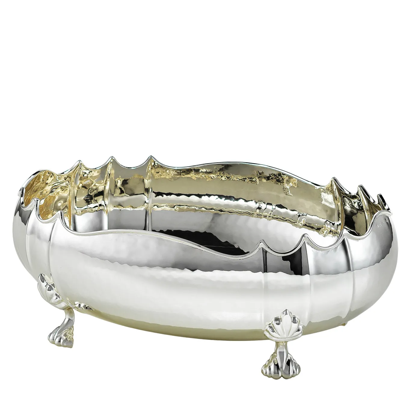 An extraordinary piece of craftsmanship that will be a stunning accent on any table or sideboard, this refined silver-plated brass centerpiece features a round body with a scalloped rim, whose sleek edges create an elegant allure on the smooth, polished surface. Sheffield-inspired, delicately crafted claw feet highlight the classic charm of this timeless piece, making it an exceptional gift for occasions such as weddings or anniversaries.