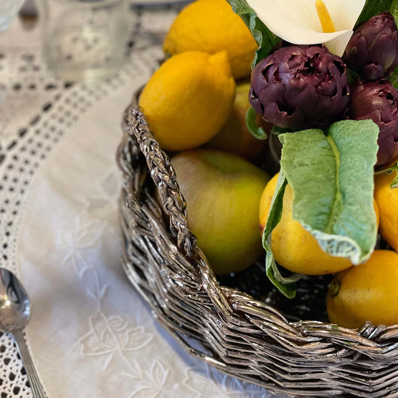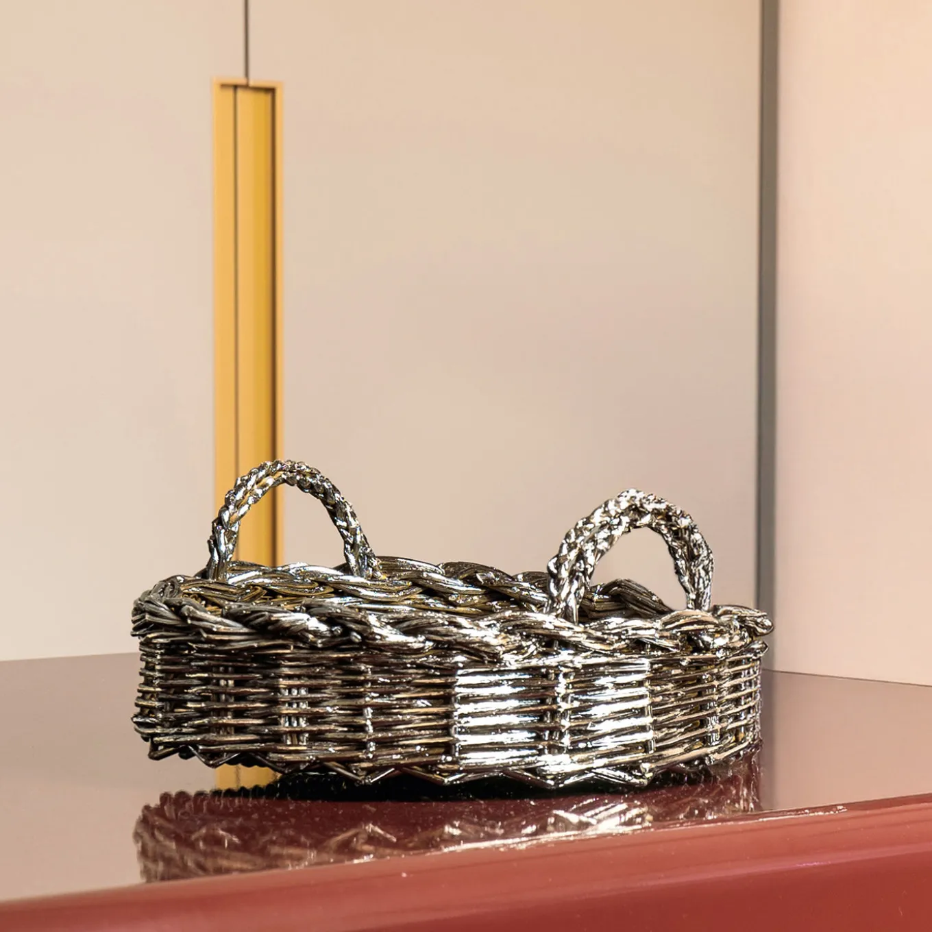 A distinctive basket featuring intricate artisanal weaving with a sculptural, refined appeal. Designed as a versatile decorative object, it suits use as an elegant centerpiece, a stylish catchall, or a display item. The basket’s organic interlaced lines and lustrous finish elevate sophisticated environments, adapting well to classic, modern, or minimalist interiors with an emphasis on craftsmanship and contemporary design.