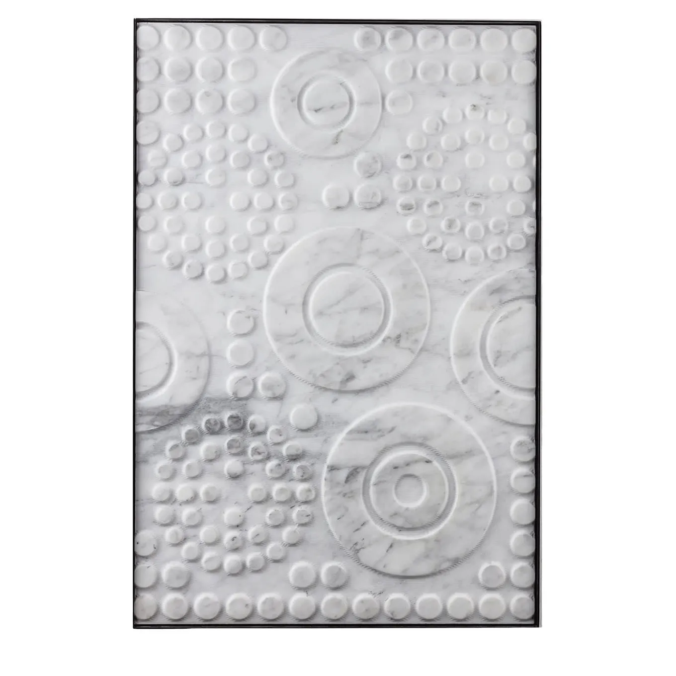 Round in white Carrara marble is part of an exclusive collection of stone artworks, featuring surfaces developed over time. Each piece reflects the vision of designers such as Michele De Lucchi, Marella Ferrera, and Marco Piva, transforming textures, geometries, and decorative details into true masterpieces. Framed in matte black metal, it is easy to mount and versatile for any space. A tribute to Lithea’s craftsmanship, it blends tradition and innovation. Frame included.
