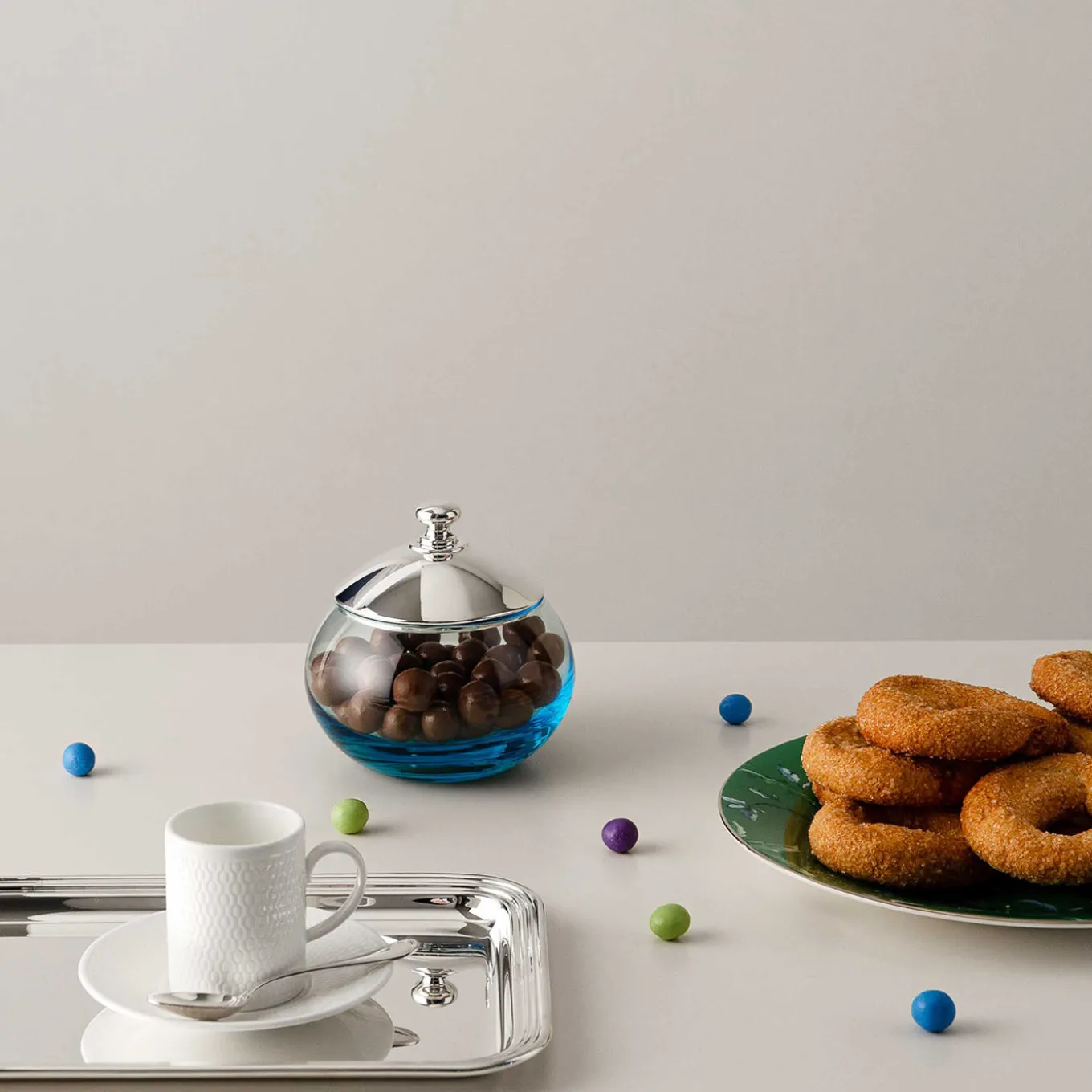 A rounded crystal jar featuring a silverplated lid with an elegant knob, showcasing a harmonious blend of minimalist design and classical influences. The jar’s smooth curved form and subtle blue gradient add a delicate touch of color while maintaining a refined simplicity. Crafted with exceptional artisanal technique, this piece serves as both a functional container and a sophisticated decorative accent.