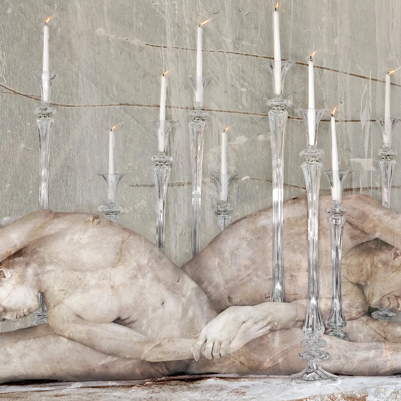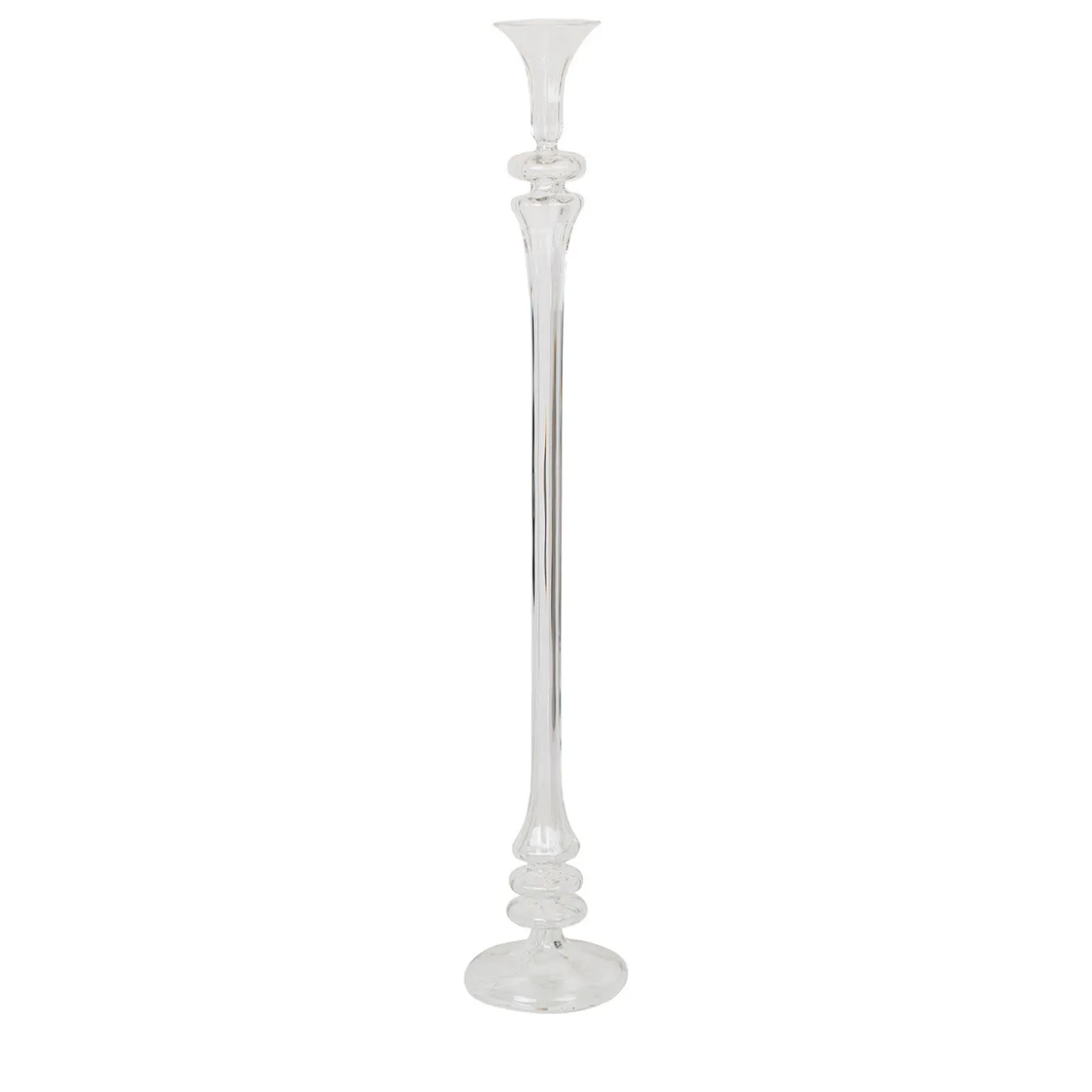 Refined and sophisticated, this candle holder boasts a polished and elegant silhouette that will make a statement in any corner or sideboard of a modern or classic home. Masterfully crafted of clear glass by expert hands, its one-meter tall body is enhanced with a flared top and bulging decorations adorning its base.