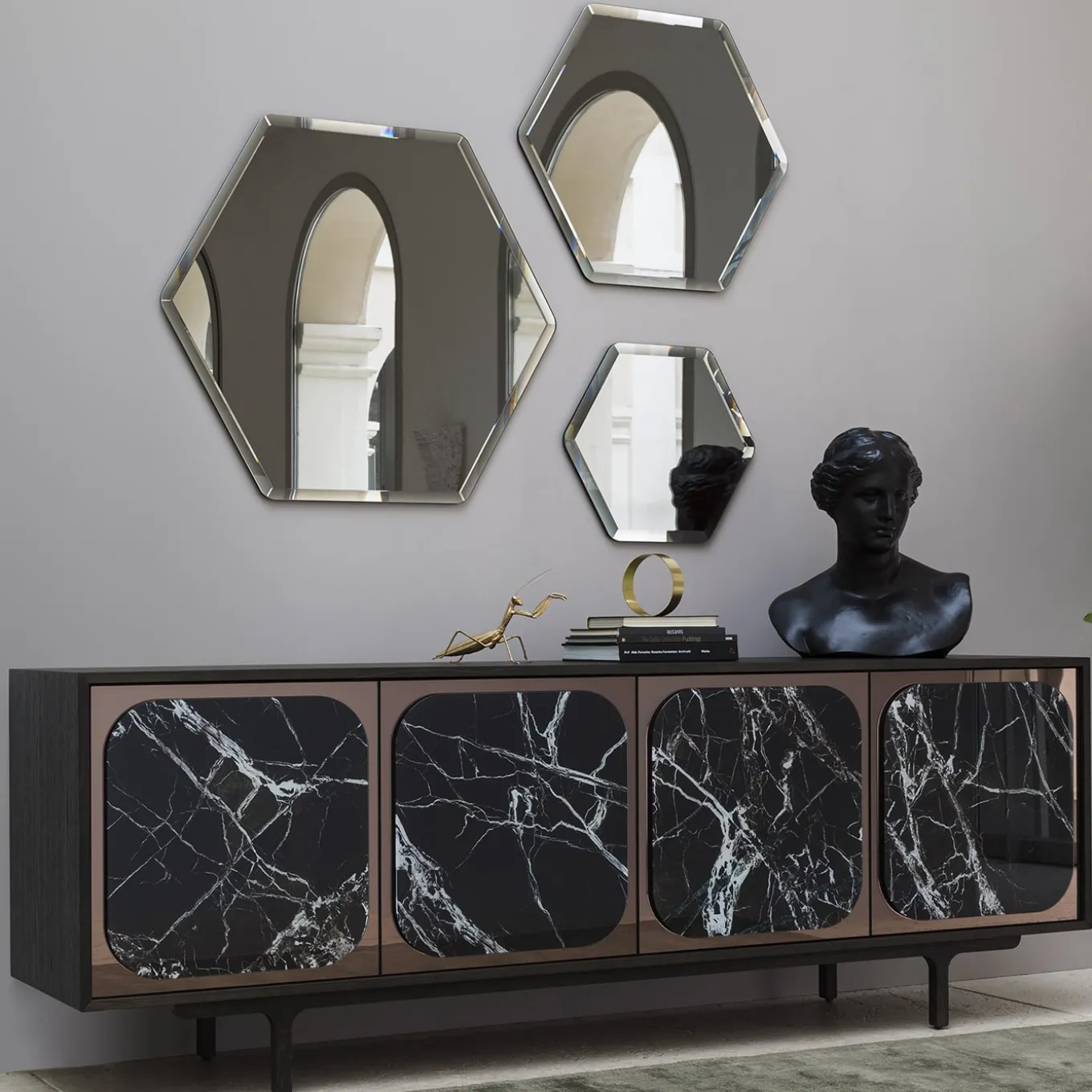 A perfect harmony between geometric rigor and softening details define the sophisitcated design of this smoky mirror. Coupled to a back panel for steady support, the 8mm-thick mirrored glass hexagon features rounded angles and is distinguished by a detailing of 30° bevelled edges lending the piece quiet textural dynamism. Medium and large variants are available.