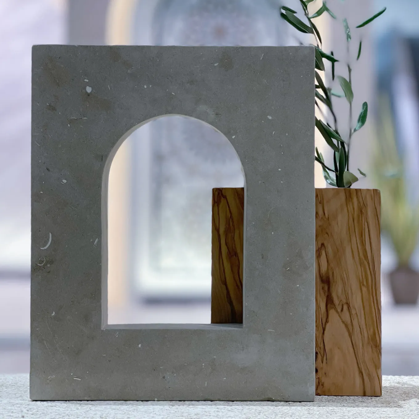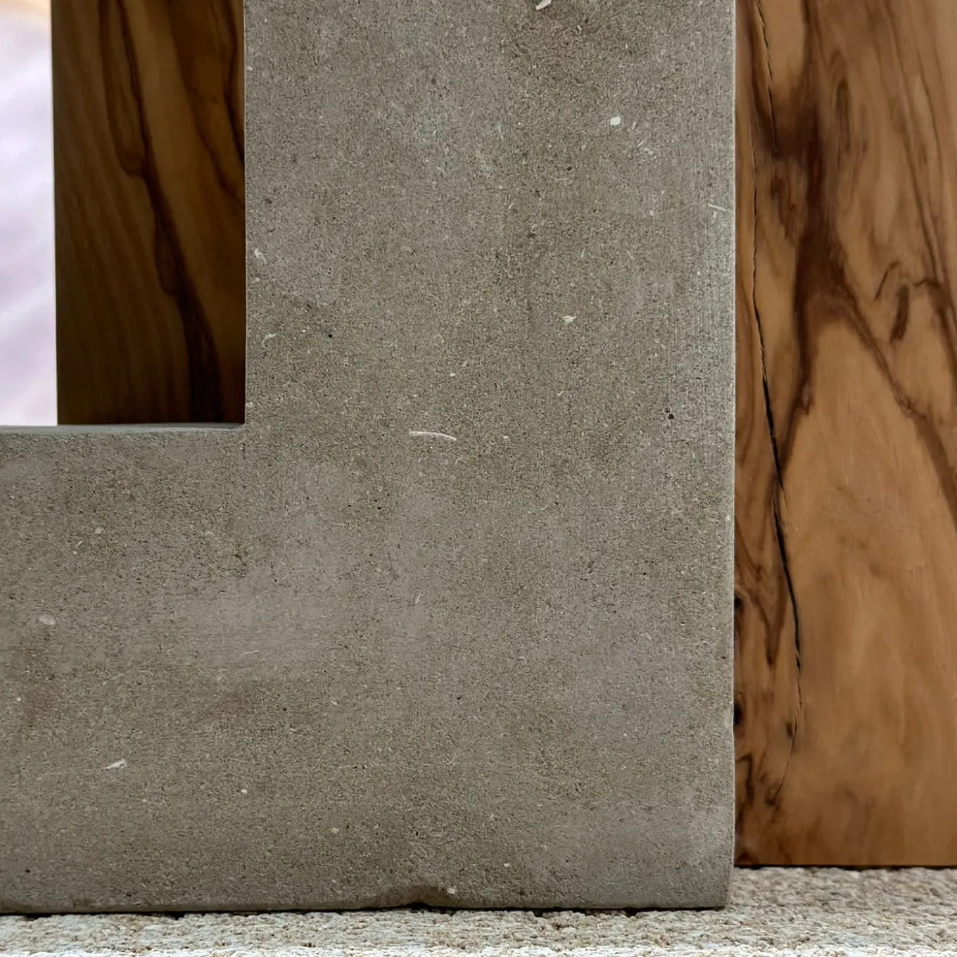 Archetypical volumes interacting in an interlocking design characterize this superb contemporary sculpture. Evocative of metaphysical scenarios, it consists of a Lecce limestone block whose central opening is functional to welcoming the olive wood door-block for an intriguingly interlocking system. The exclusive use of olive afflicted with Xylella – a plant pathogen – reveals the sustainable ethics behind the design.