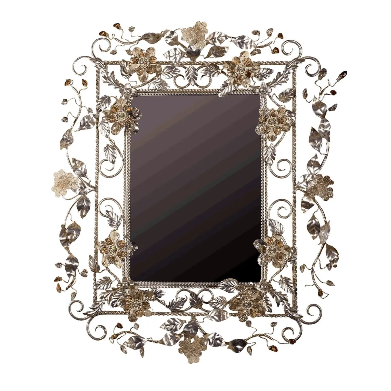 This wall mirror is a superb design where the gaze can lean on a triumph of intricate phytomorphic elements. An ideal addition to exclusive interiors due to its outstanding decorative character, it flaunts leafed branches rich in Bohemian crystal flowers that extend on a double wrought-iron frame that encircles the mirrored glass while enchanting with the sheen of its silver leaf finish.