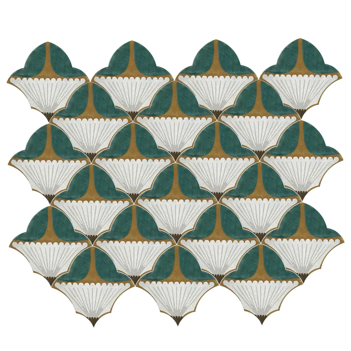 Inspired by the elegance of fan-shaped patterns, the Saffron ceramic tile composition features a harmonious blend of green, white, and brown tones. Hand-painted on a matte terracotta base, this unique design evokes a sense of vintage sophistication. The bold shapes and intricate details create a dynamic effect, perfect for walls or floors. Its retro aesthetic adds a touch of 1970s charm to any interior. Price is per square meter. Please contact the Concierge for technical specifications.