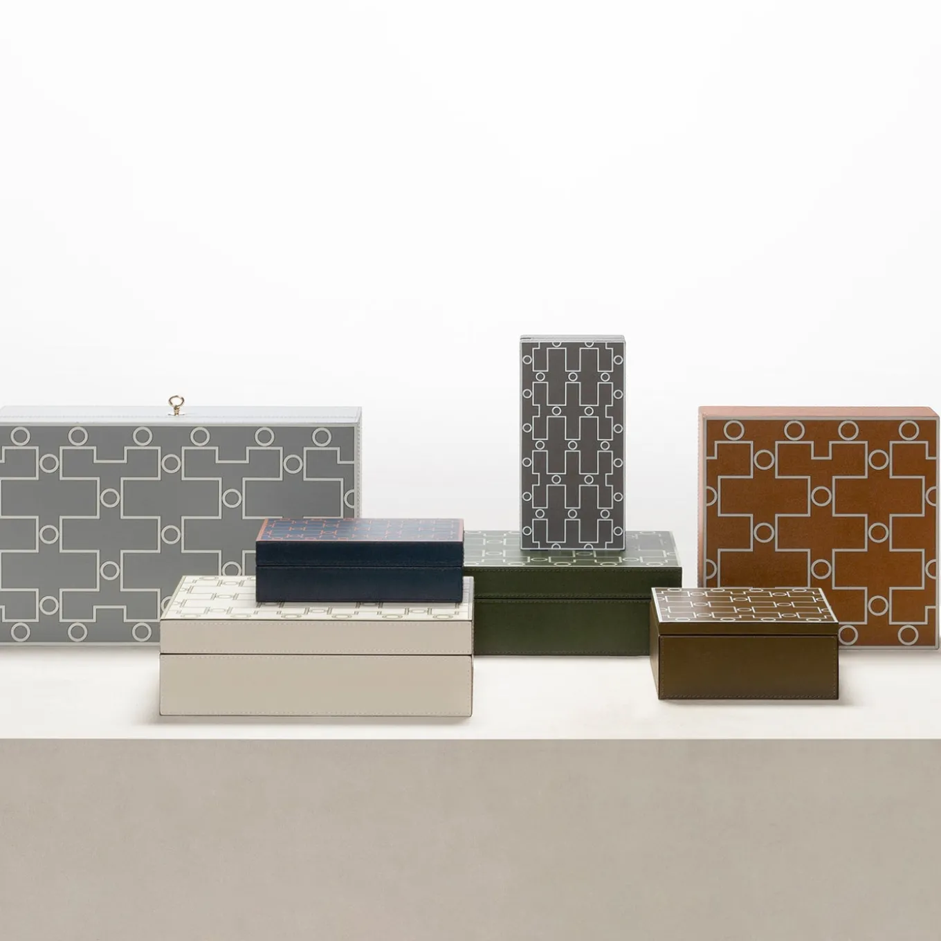 With patterns that directly take inspiration from characterizing details found in suggestive corners of Venice, these printed leather boxes are a celebration of the iconic city on water. Featuring different sizes, shapes, and purposes, the San Marco collection of boxes combines historic legacy with modernity, and is the expression of the artistic and cultural vivacity that marked, and still does, this city’s history. Print only available as showcased.