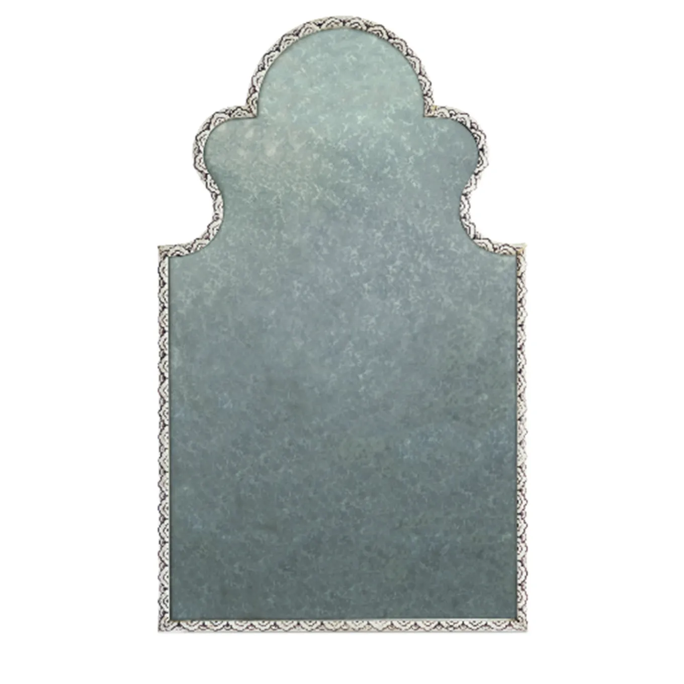 Inspired by the Venetian windows that bear the trademark of Palladio’s work, this perfectly symmetric mirror has wooden frame with an arched top and scalloped edges. The eye-catching silhouette is enhanced by the white finish that is hand decorated in a black scalloped design to add a touch of vintage glamour. This simple yet stunning mirror will be a great addition to any room, creating a focal point in an entryway, living room or bedroom.