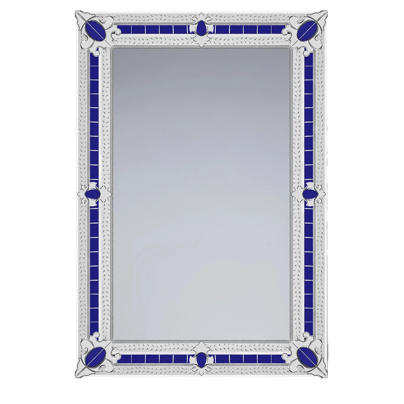 Magnificent rectangular mirror composed of beveled and silvered mirror embroideries in the corners, all handmade with bands engraved with a floral subject, on a blue Murano glass mirror background. This miniature reproduction of a larger mirror is best suited to luxurious homes in both contemporary and classic décor. Mirror made entirely by hand by Fratelli Tosi on Design by Fratelli Barbini Glass Mirror on the island of Murano.