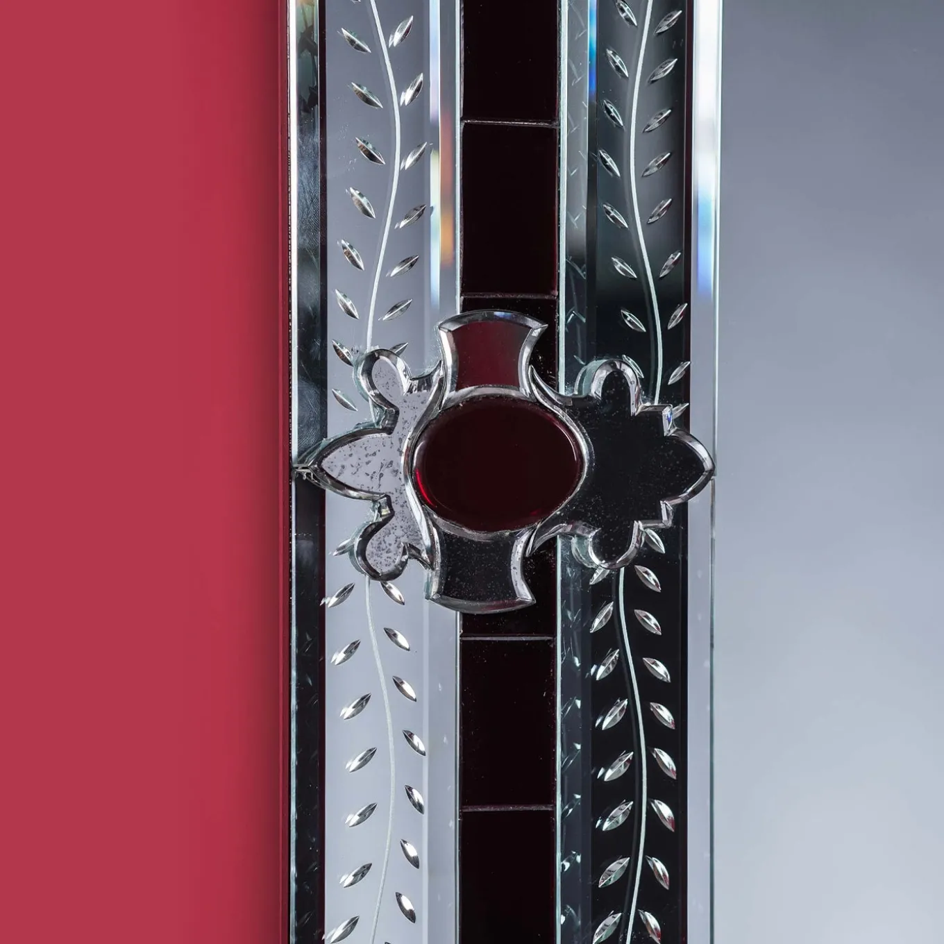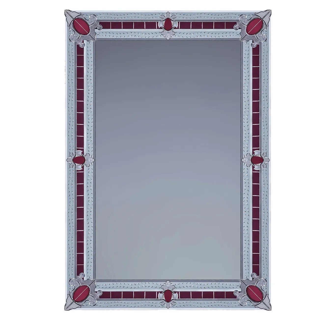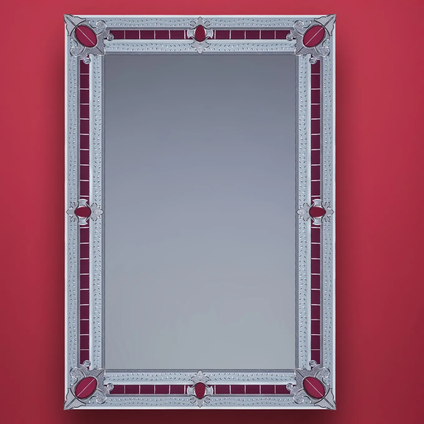 Magnificent rectangular mirror composed of beveled and silvered mirror embroideries in the corners, all handmade with bands engraved with a floral subject, on a red Murano glass mirror background. This miniature reproduction of a larger mirror is best suited to luxurious homes in both contemporary and classic décor. Mirror made entirely by hand by Fratelli Tosi on Design by Fratelli Barbini Glass Mirror on the island of Murano.