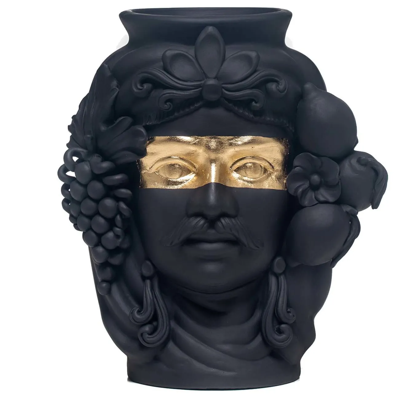 With her collection of anthropomorphic vases master, ceramist Stefania Boemi pays tribute to Sicily’s rich Moorish influence, reinterpreted in monochromatic colors.‎ This representation of a Moor man is handmade of terracotta with a hand-painted matte black glaze, to reveal the stunning decorative details of the ornate headdress with luscious fruits framing the noble face. A band of gold foil highlights the eyes with warm and shimmering hues to add a captivating visual contrast. The vase cannot be filled with water.