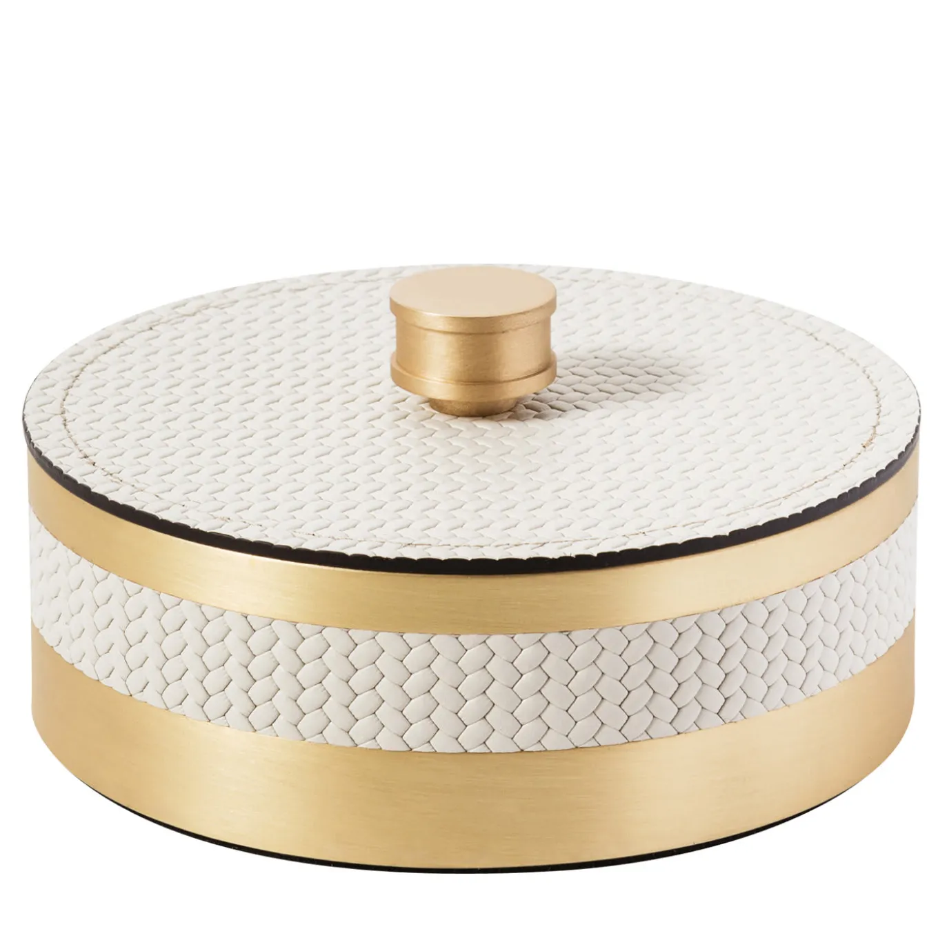 Either alone as precious and versatile object to adorn a powder room and store everyday essentials, or combined with other pieces from the Saturno Collection, this large box with lid will add a charming accent to a modern or classic home. The box’s round silhouette is adorned all around its circumference with a white leather band that occurs also in the lid and handle. Other types of leather are available – please ask the concierge for details.