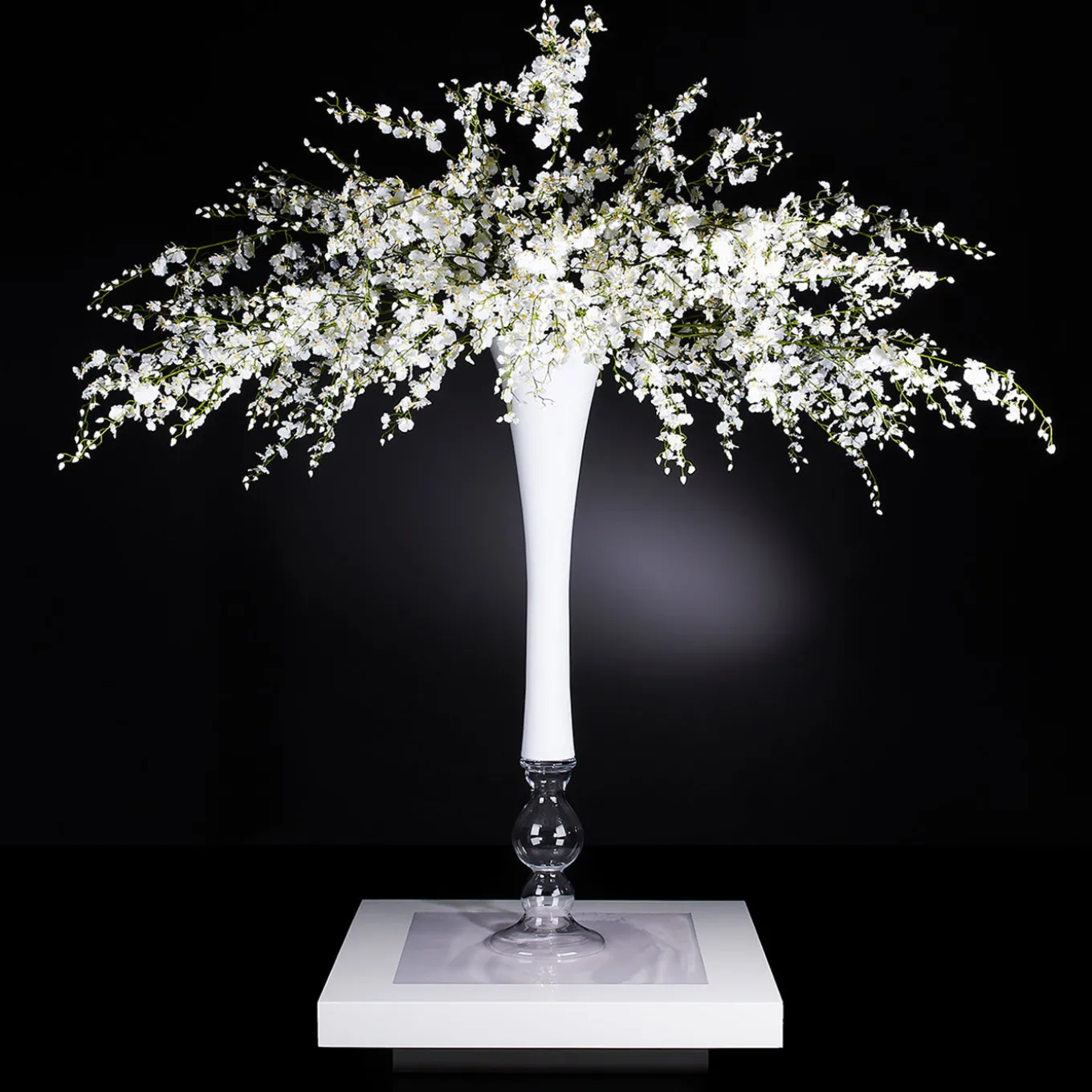 An elegant glass vase with a fluted, elongated silhouette lends a vintage feel to this sophisticated floral arrangement that will fill your home with spring’s beauty year-round. Featuring a cascade of high-quality faux white oncidium orchids, this vase can be displayed both indoor and outdoor to accent any formal soiree with its exclusive style.