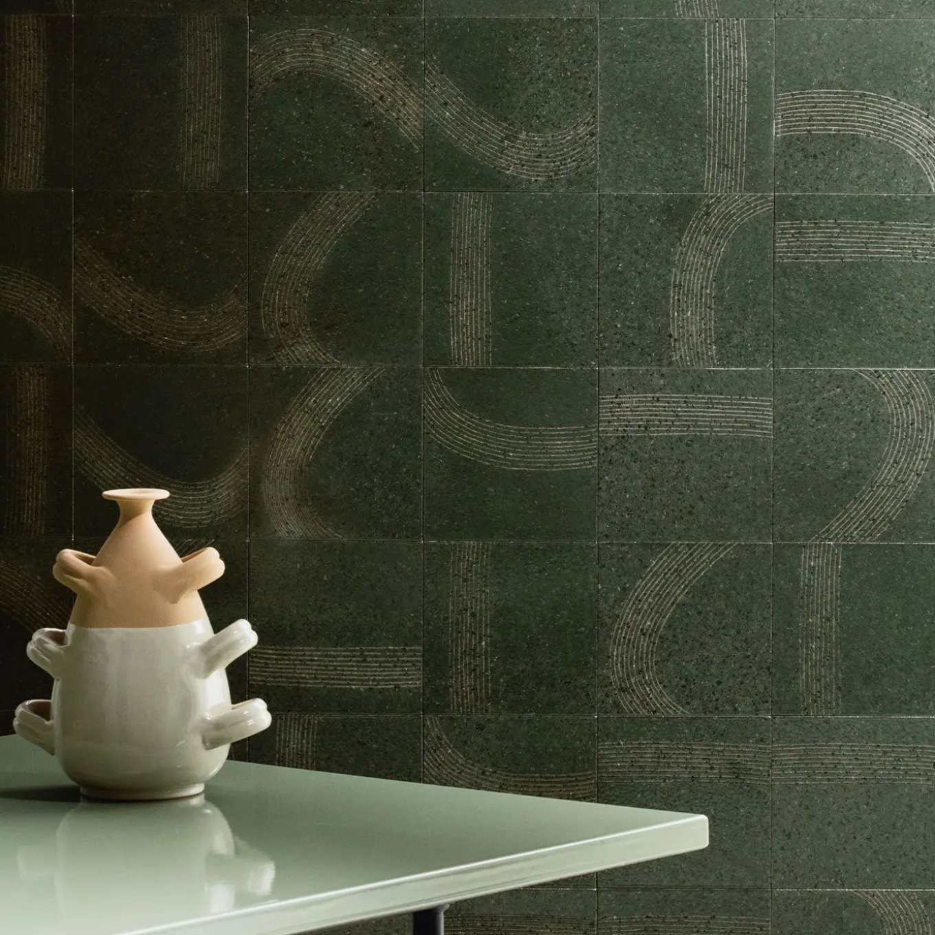 Fashioned of Etna volcano stone and glazed in a refined tone of olive green, this set of 25 ceramic tiles is hand-decorated with delicate etchings reminiscent of wakes (“scie” in Italian) that will lend authenticity to any interior. Masters Nicolò and Fausto Parrinello craft every tile (20x20cm) following a cutting-edge technique based on low relief. It resists both strikes and temperature jumps.