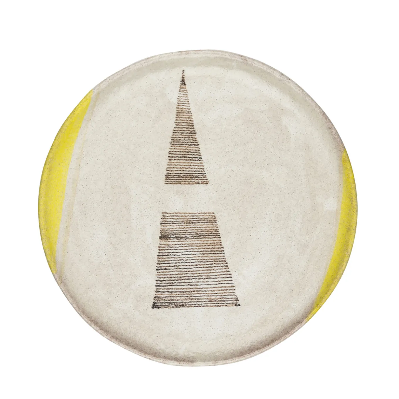 This elegant plate in ceramic was handcrafted and the enamel of its colors glazed using ancient techniques. The off-white of the background is brightened by touches of vivid yellow on the sides, while in the center there is a geometric decoration obtained with tiny parallel brown stripes. This one-of-a-kind plate can be used as modern decoration or everyday to illuminate the table. Also available in the d18 cm version.