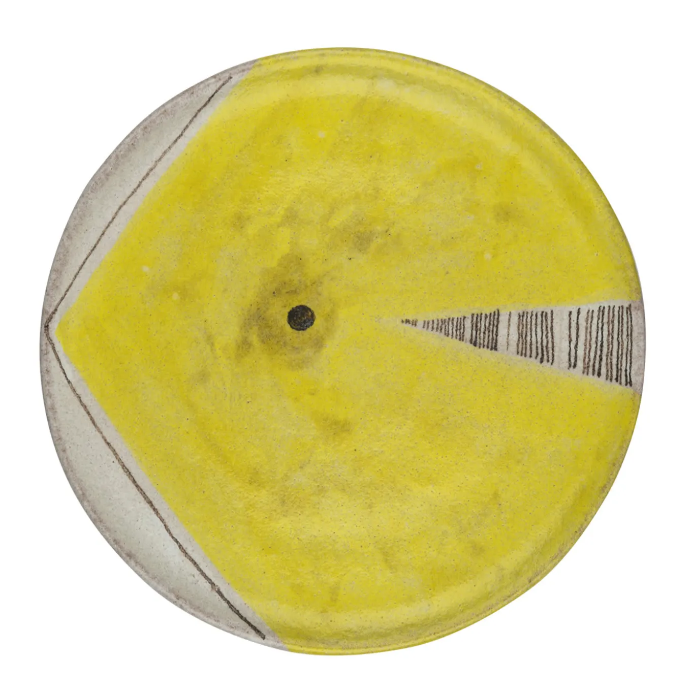 Entirely made by hand using traditional techniques, this plate was finished with glazed enamel and bears a vivid yellow color with the exception of striking brown geometric decorations that are delicate and hypnotic at the same time. This piece can be used as a decorative plate, centerpiece, or for everyday use, bringing modern allure and tradition to the table. Also available in the d18 cm version.