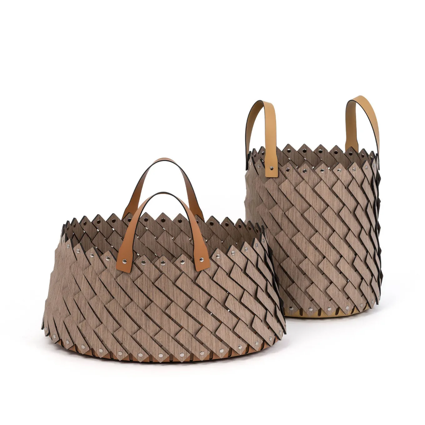 The Sestriere medium wood basket features the iconic Pinetti weave pattern reinterpreted with a flexible decorative recomposed wood veneer. This basket sits on a base crafted from regenerated leather and is accented with branded Alpi® wood. Enhanced with sturdy handles and a base made from regenerated leather, this basket combines durability with sophisticated style, making it a versatile storage solution for various interiors.
