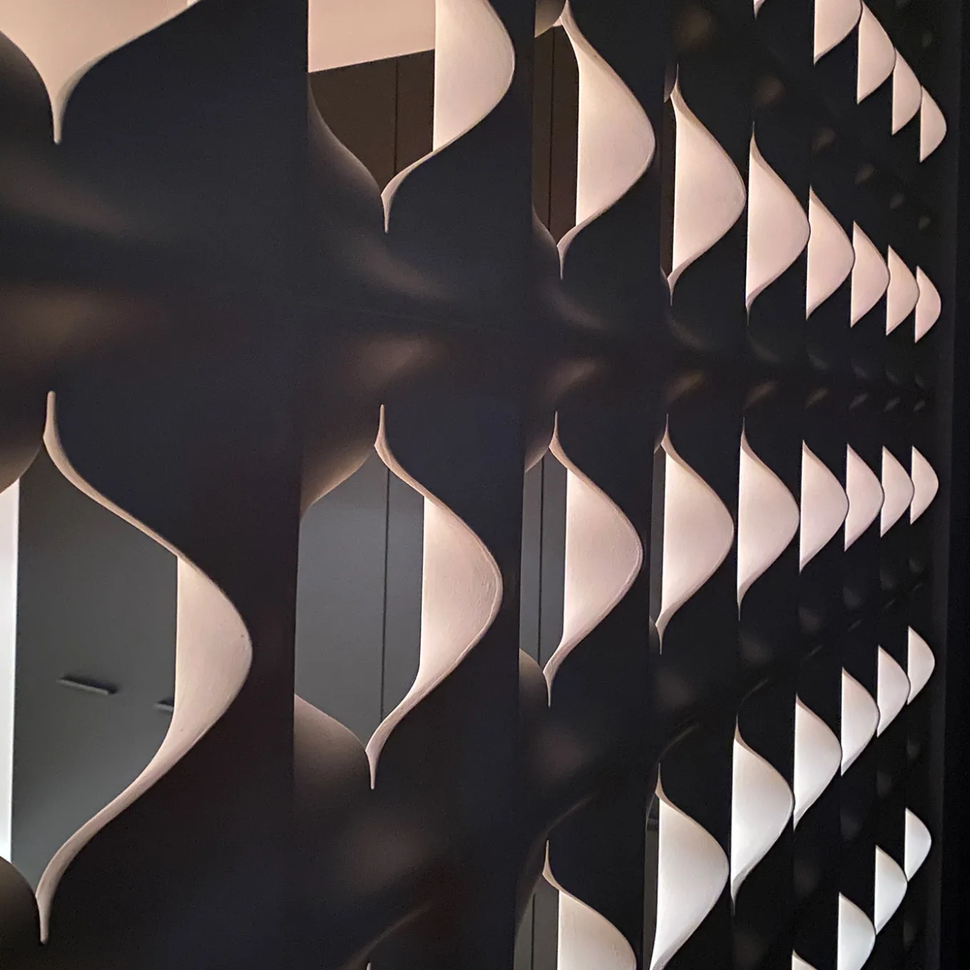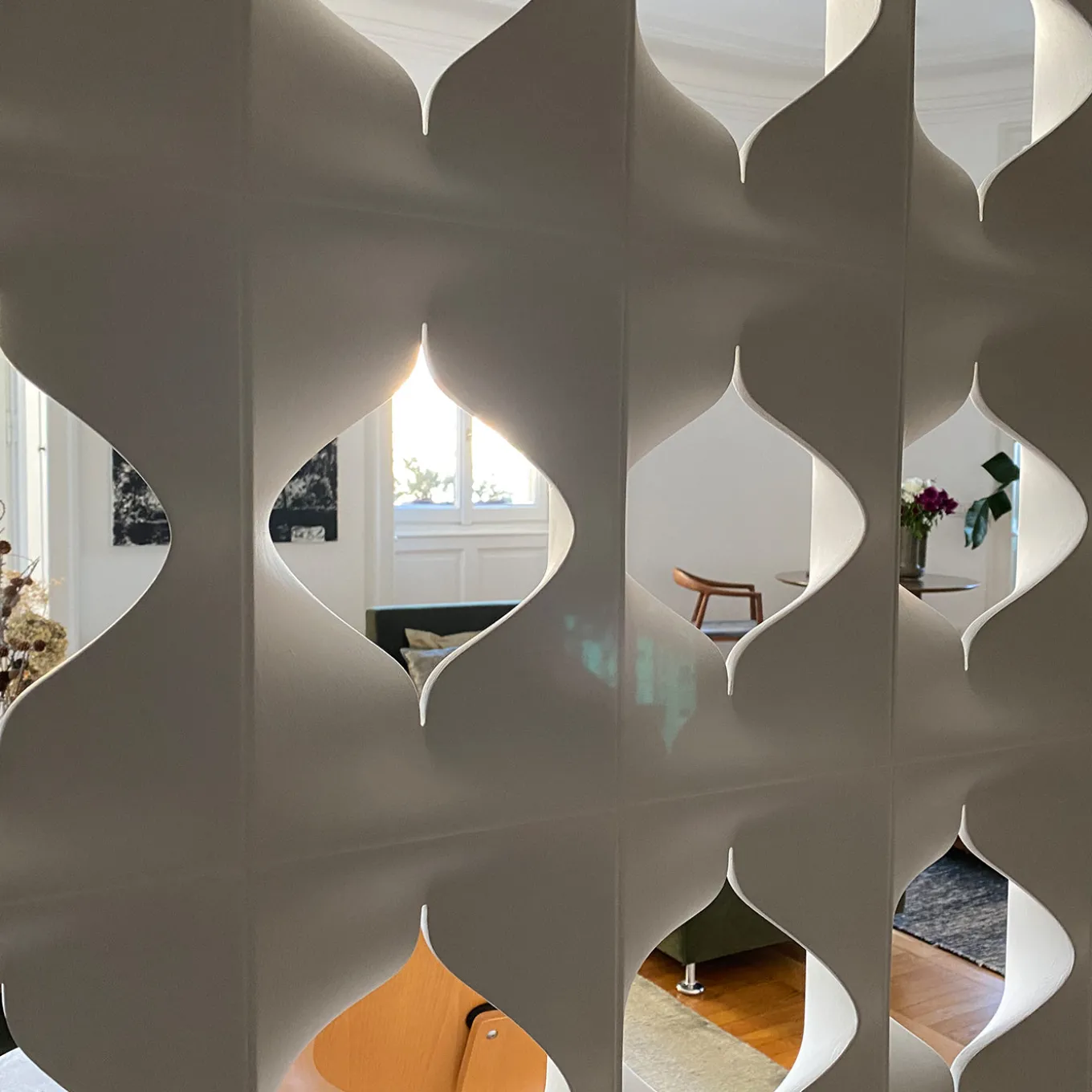 This screenblock was inspired by the elegant metal grates of historic Milanese architecture and mid-century Brazilian design. Designed to separate spaces without fully dividing them, the asymmetrical blocks create a unique optical effect: one side offers a clear view through, while the other provides near total privacy. Made from reinforced plaster, they can be customized with any color after installation. Suitable for both indoor and outdoor use with proper treatment. The displayed price refers to the minimum order of 0.9 m² (3 packs of 5 blocks each).
