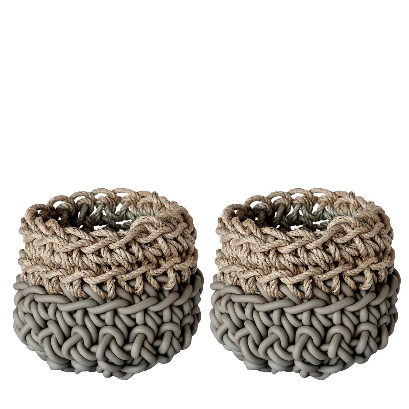 Flaunting a small yet extremely functional and stylish design, this set of two baskets displays an innovative combination of textures and hues. Deftly crocheted by hand using natural hemp yarn and 8mm-thick gray-colored neoprene yarn, it will serve many different purposes. This design is available in various colors, please consult the Artemest catalog for options.