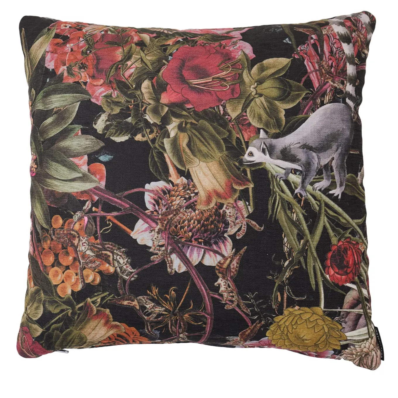 This set of two decorative cushions features the Zaira pattern, offering an immersive experience into the wild. Intricate details of vibrant flowers and exotic fauna create a striking contrast against the dark background. This bold yet elegant choice, combined with the softness of the velvet cover, adds depth and a touch of adventure. They can be printed with any design from the Instabilelab collection. Upholstery included. Please contact the concierge for further details.