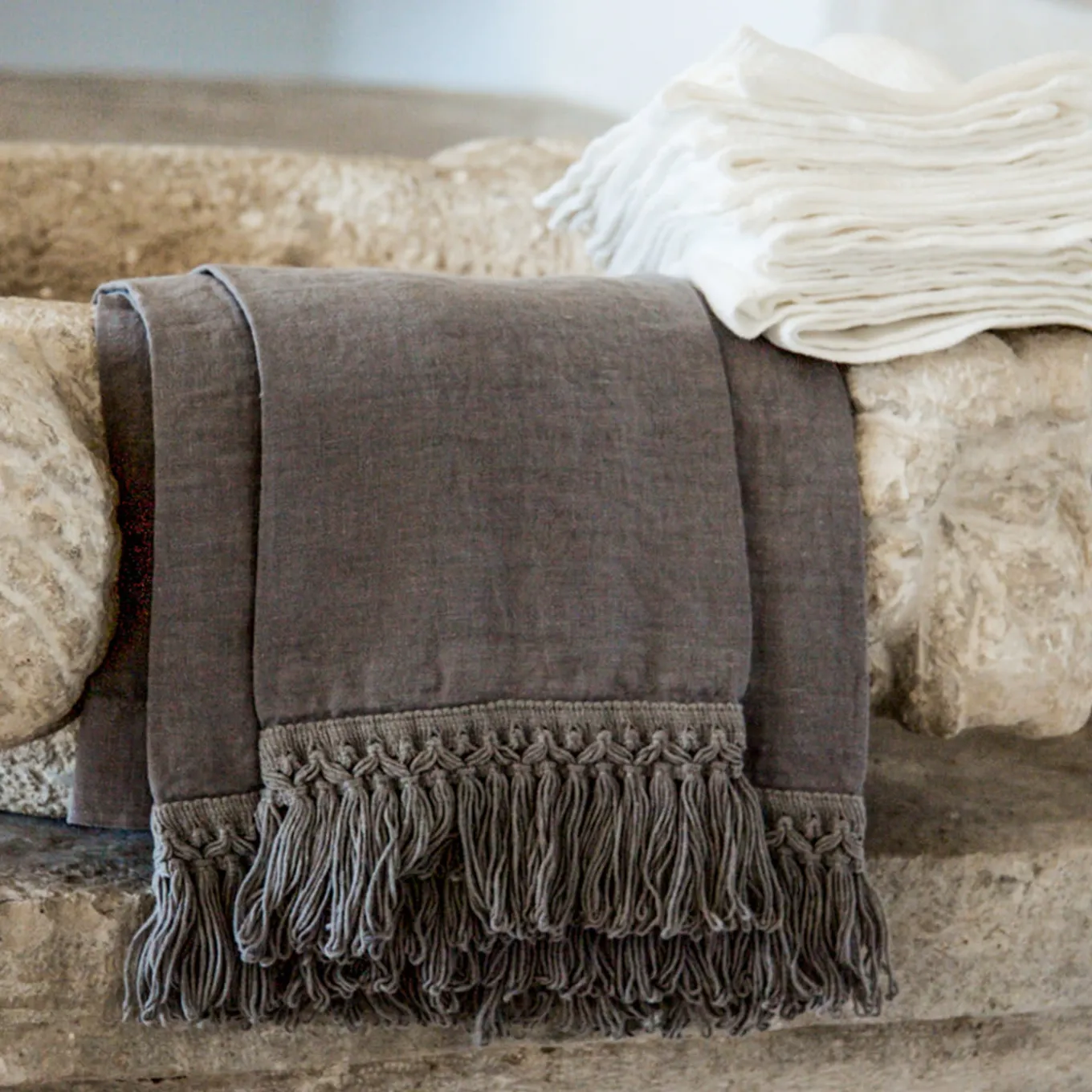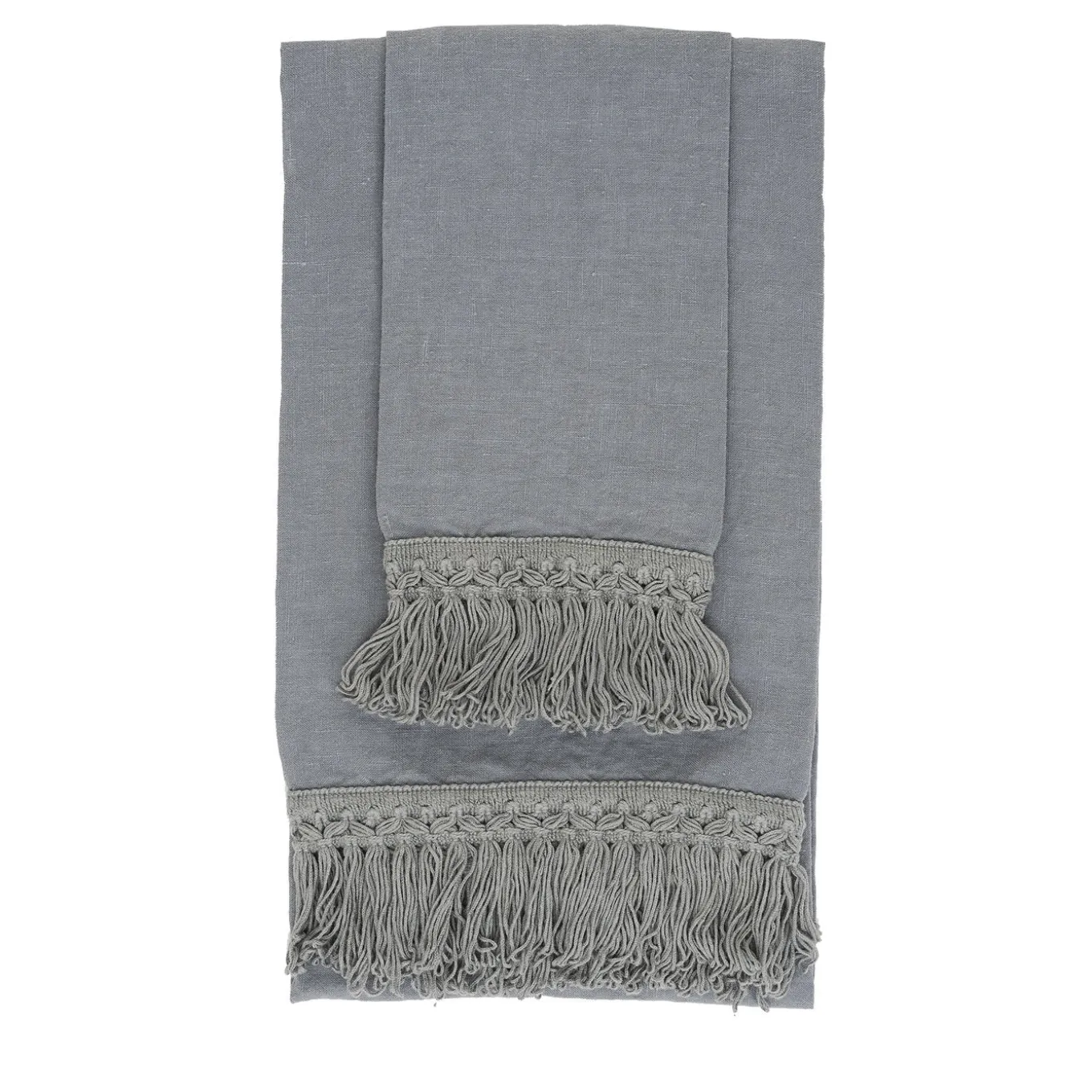 A timeless and elegant addition to any bathroom, this exquisite set of towels will add sophistication to everyday life. The medium weight linen (280 gr/sq m) was cut and crafted by hand to ensure the best quality and softness, and dyed a sophisticated light blue shade that will complement both a classic and a contemporary decor. The two towels, enriched by a stylish fringe decoration, measure 40 x 60 cm and 60 x 100 cm.