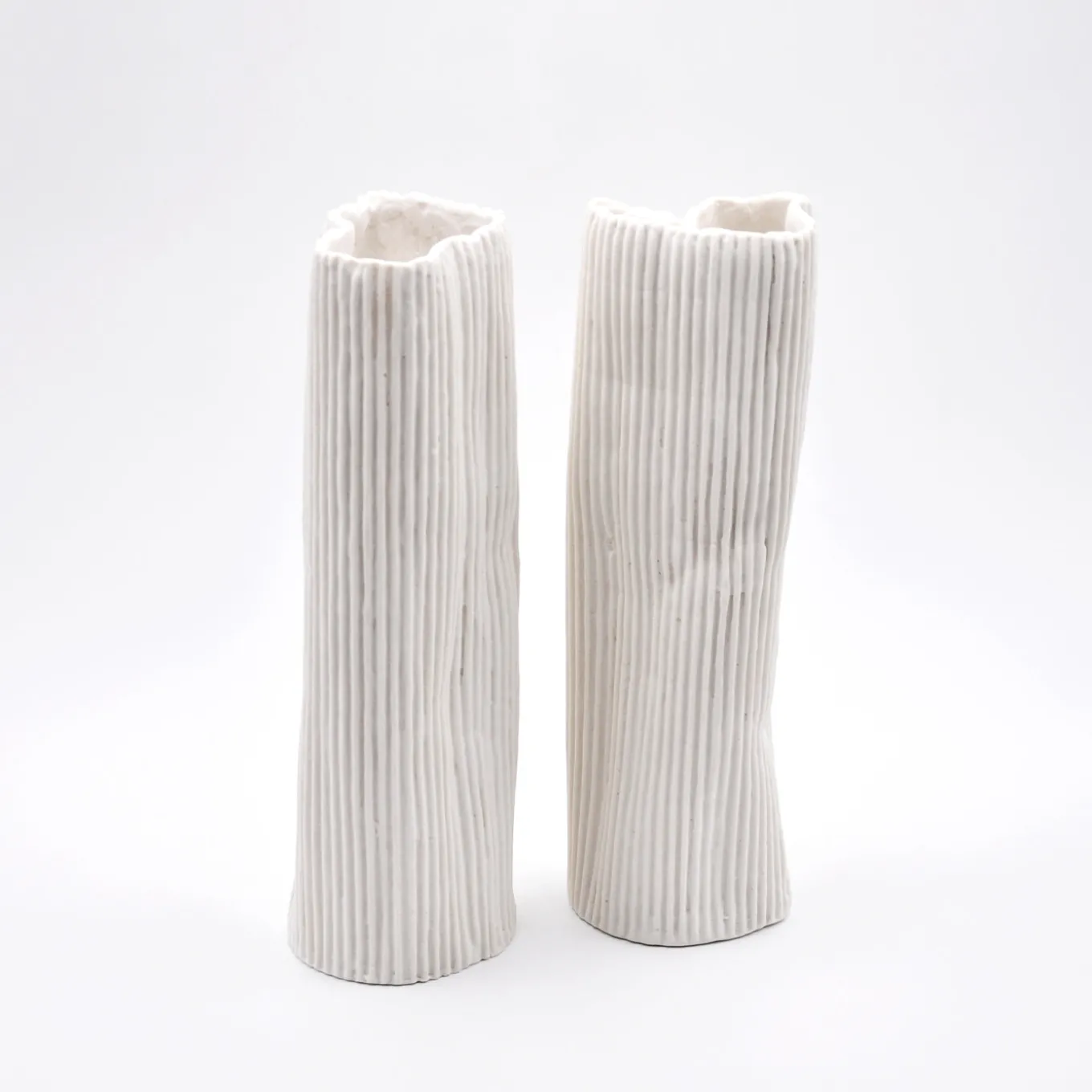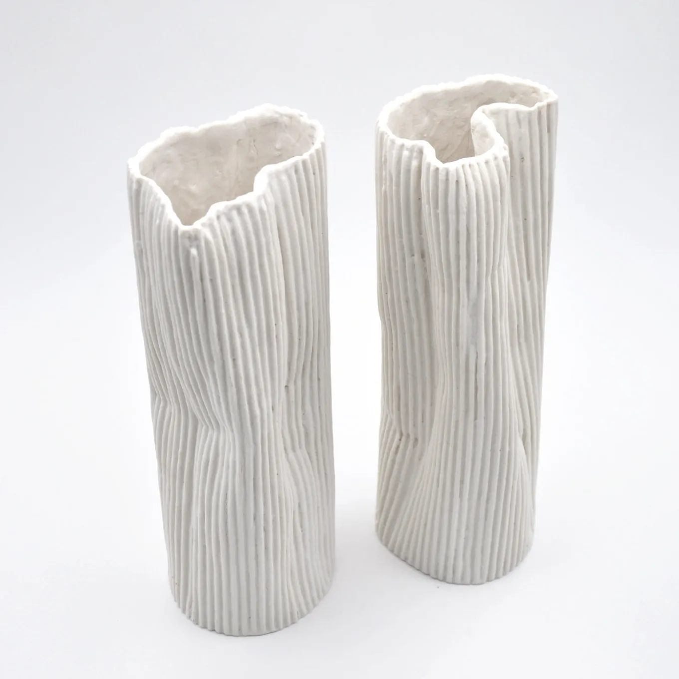 Set of 2 decorative vases “Paesaggio 19 #3” by Nino Basso, featuring a minimalist design with vertical relief waves. Crafted from a fine ceramic composite with paperclay, each vase showcases a textured white surface with natural roughness and unique free-formed handles created during firing. Measuring 26 cm in height, with diameters of 8.5 cm and 8 cm respectively, these vases offer an elegant and distinctive addition to any space. Includes presentation box, authenticity certificate, and care instructions.