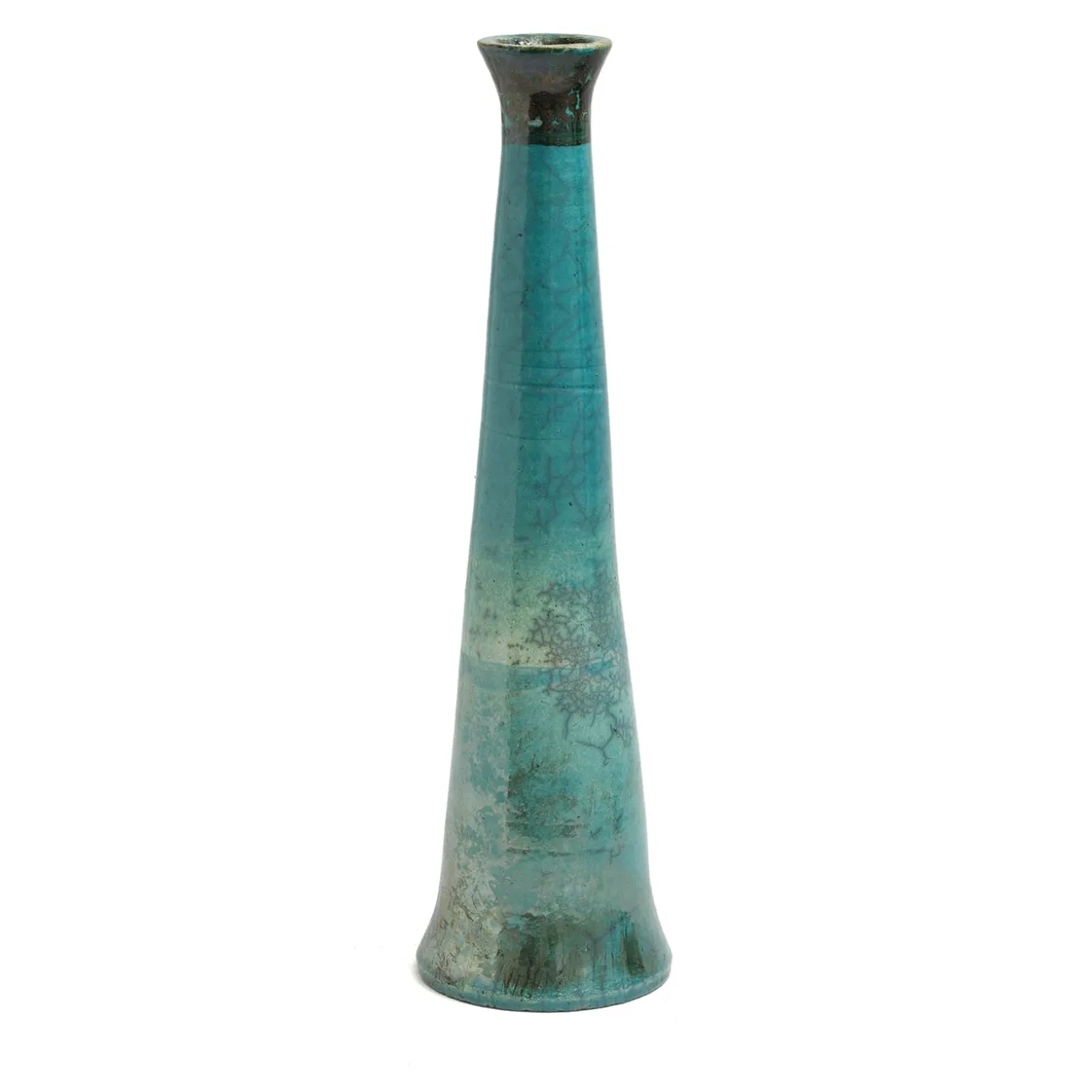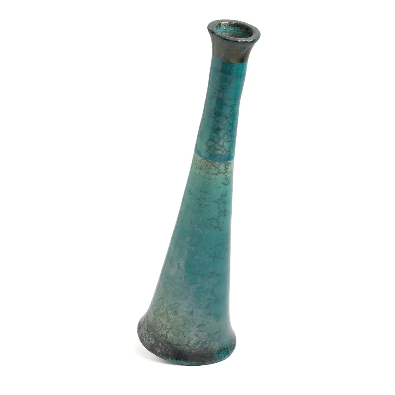 A metallic effect covers these two tall candle holders so masterfully crafted that these pieces have a mirror effect along with their entire bodies. Different shades of green and turquoise are contained by a shiny black top and a metallic dense bottom showcasing attention to details and a full understanding of the raku firing technique.