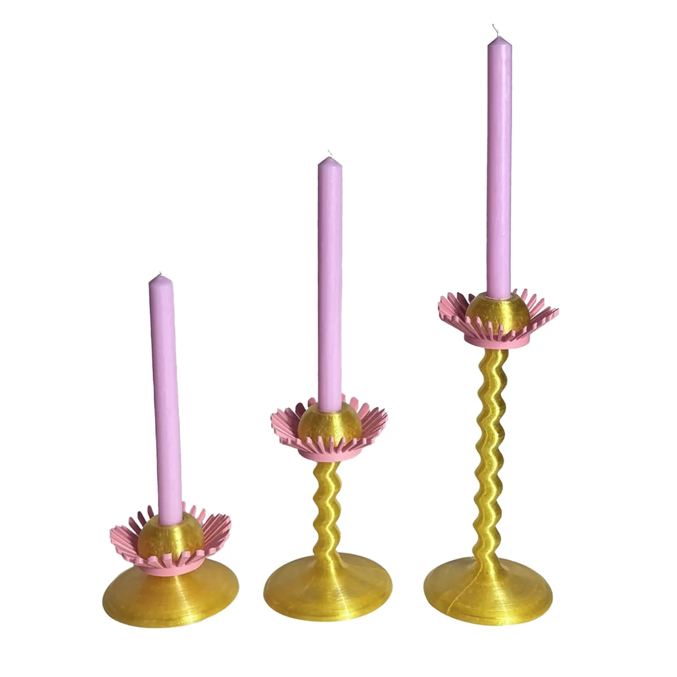 This set of three flower-shaped candle holders is 3D-printed in eco-friendly PLA with a silk-like finish. Featuring gracefully twisted stems in gold with pink petals, they function as both lighting and decorative elements for table arrangements or displays. Available on the Artemest catalogue in sets of 2 or or 4. Please contact the Concierge for more information. Candles are included. Heights: 8.8 cm, 18.8 cm, 28.8 cm.