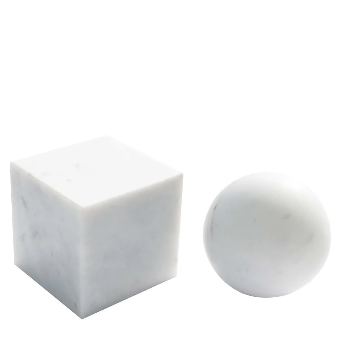 Used purely for decorative purposes or as handy paper weights, this Set of Decorative Objects in White Carrara Marble consists of a white 8 cm diameter ball and a 10 cm cube. The unique and elegant pieces feature a matt finish and will add a look of style and luxury to your desk or table.