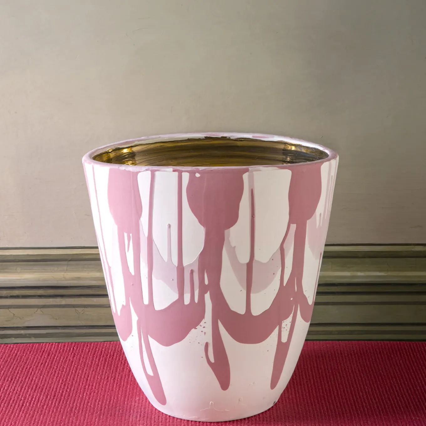 This vase features a stunning opaque slipware exterior whose decorations resemble the flourishes on a Neoclassical vase. Delicate yet dynamic pink brushstrokes run across its white surface. The interior is entirely in lustrous gold. The item has a unique flared shape with elliptical mouth. Height: 30 cm. Handcrafted in Italy.