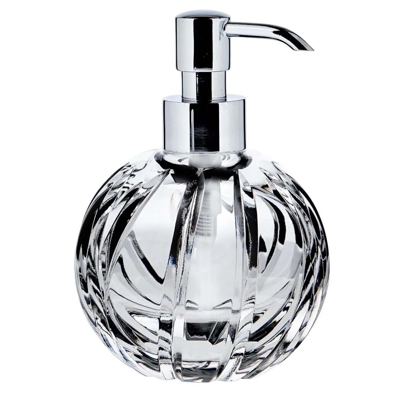 Part of the enchanting Skyline Collection, this spherical soap dispenser in transparent crystal transforms the ordinary, everyday gesture of washing hands into an occasion to appreciate the boldness and delicacy that in it simultaneously coexist. The characterizing grooves create the conditions for an optimized grip while offering a captivating distorted image of the liquid housed within.