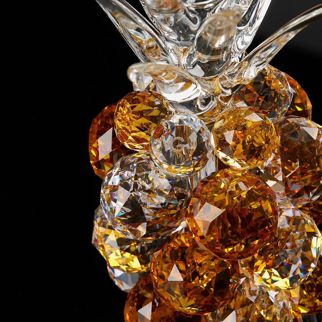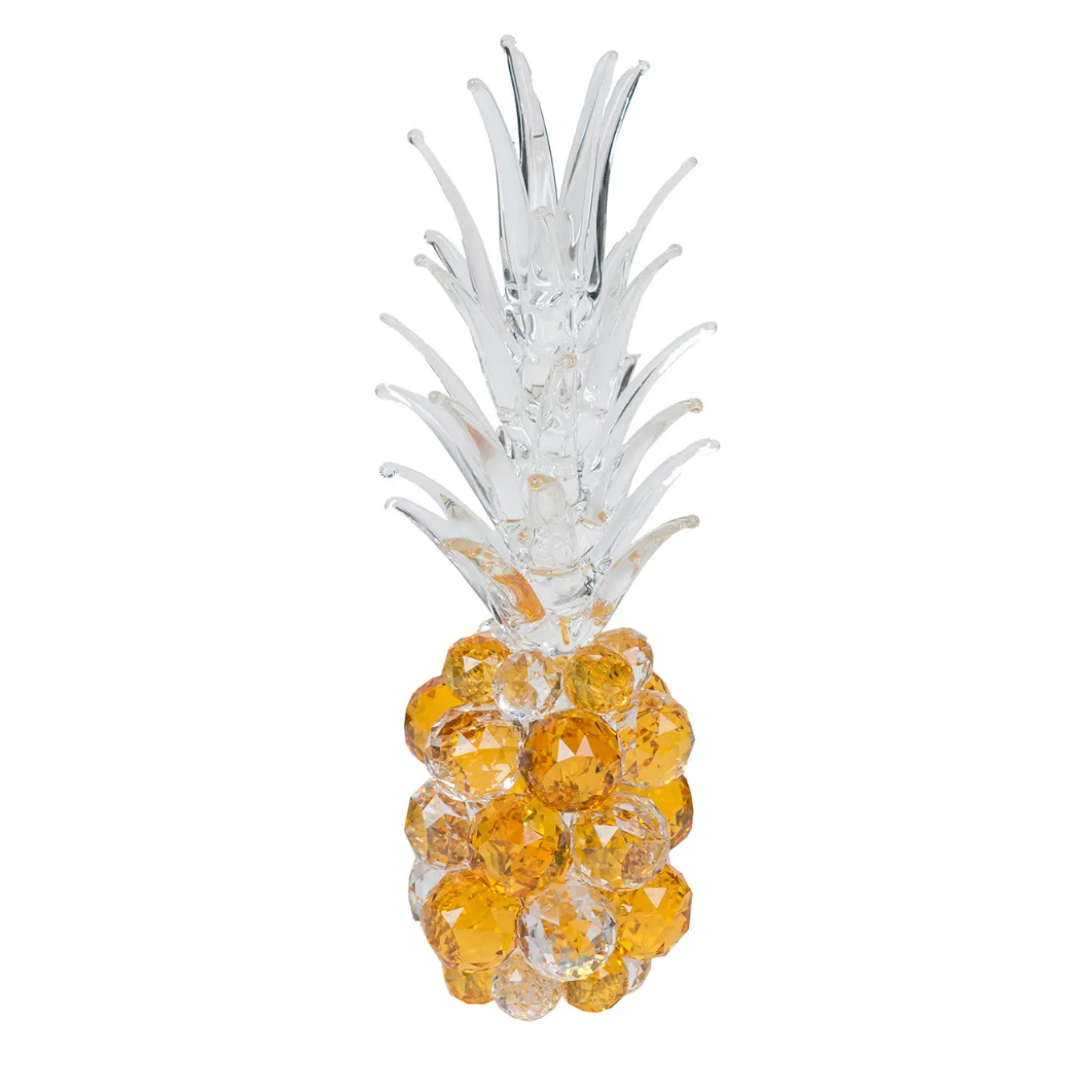 An exquisite combination of clear and warm hues, this sculpture is part of a series of decorative objets d’art that flaunts pineapple-shaped refined silhouettes. Masterfully handcrafted of crystal by expert artisans, it will make a singular addition to a modern and elegant interior.