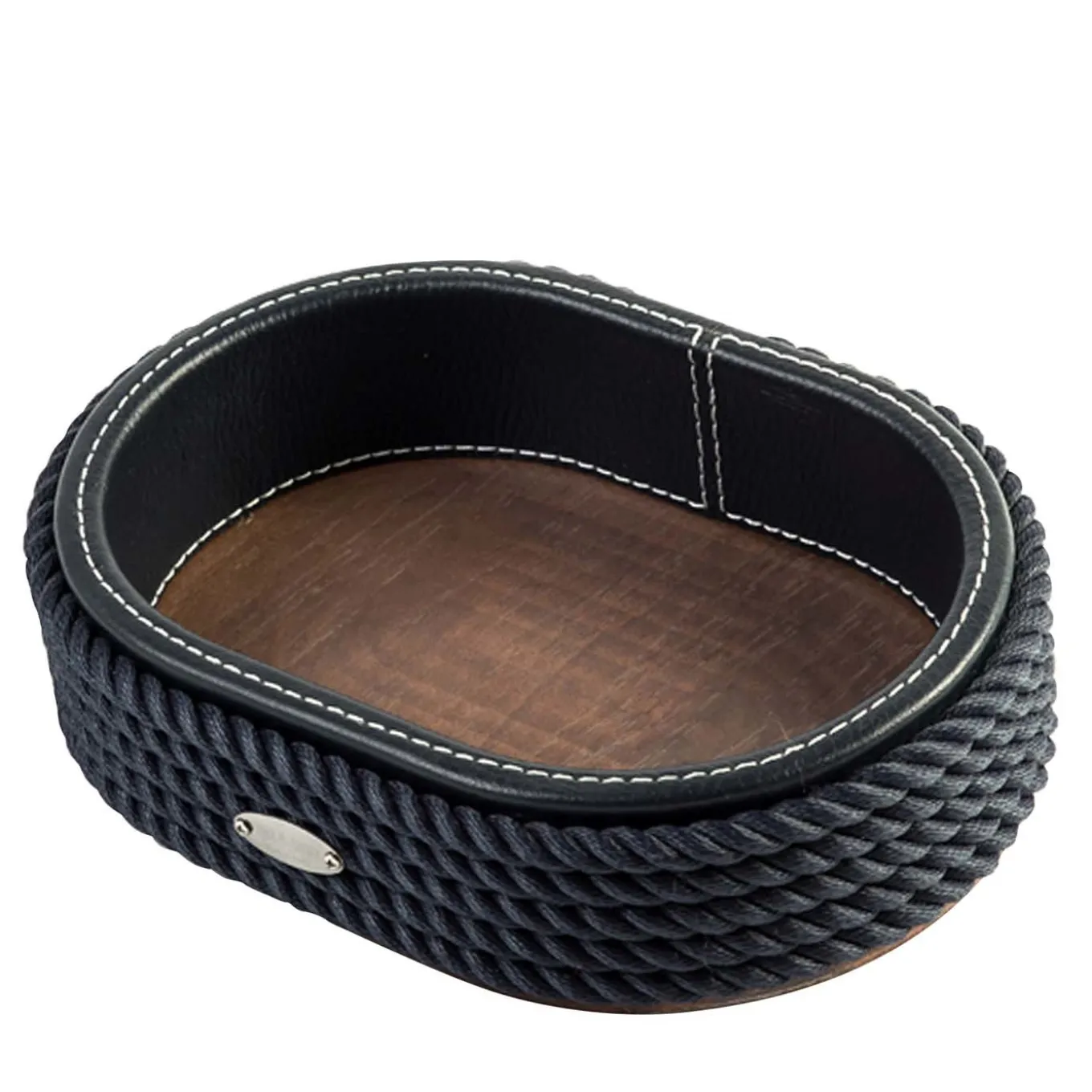 Fashioned of solid wood with a dark finish, this superb vide-poche is enriched with details in nautical-blue leather and rope with a sophisticated tall border. The perfect accessory on an entryway console or bedroom dresser to put keys, loose change, and other small objects, this refined design can find its spot anywhere in the home, from bathroom to living room. A suitable addition in both contemporary and classic interiors, this vide-poche will be a well-appreciated housewarming gift.