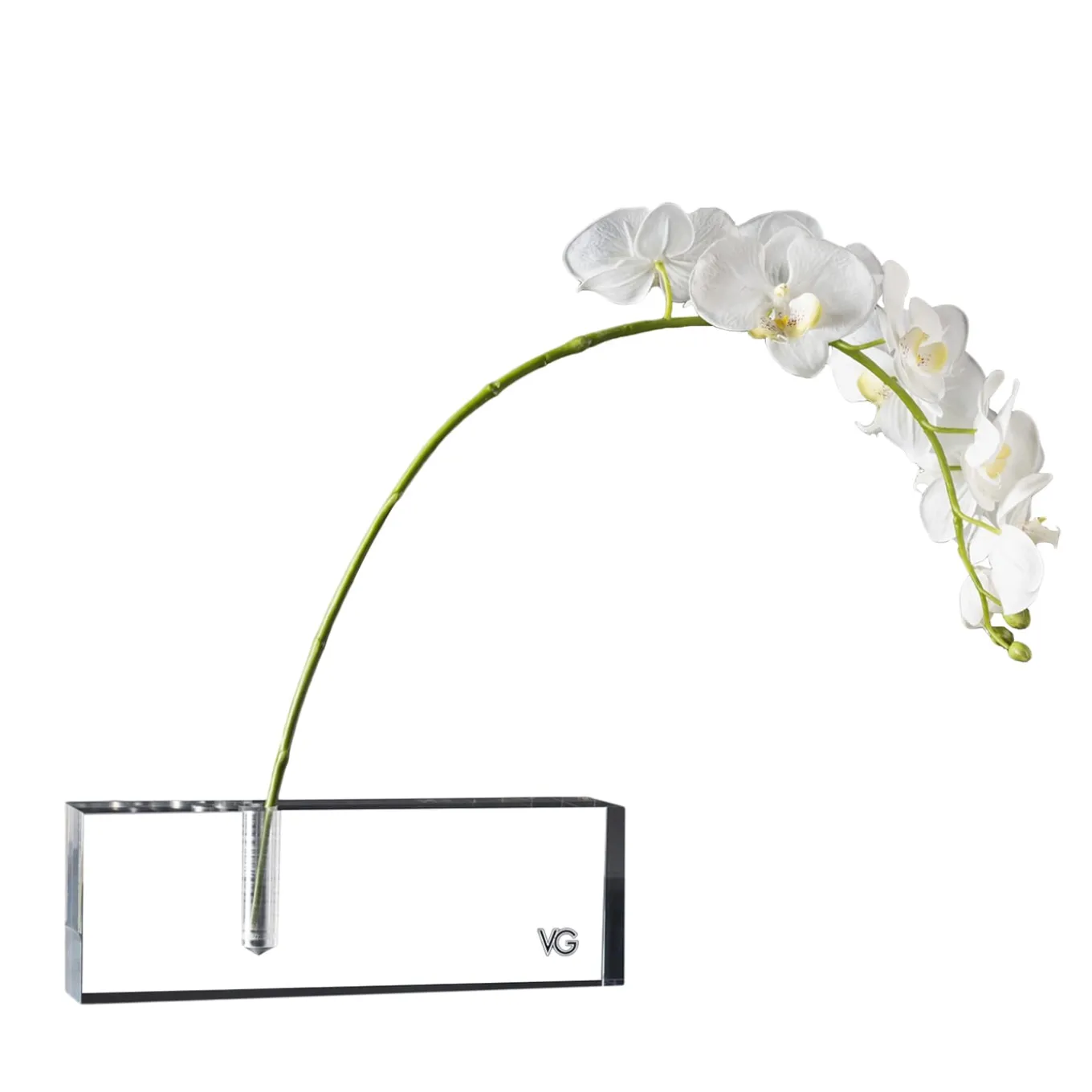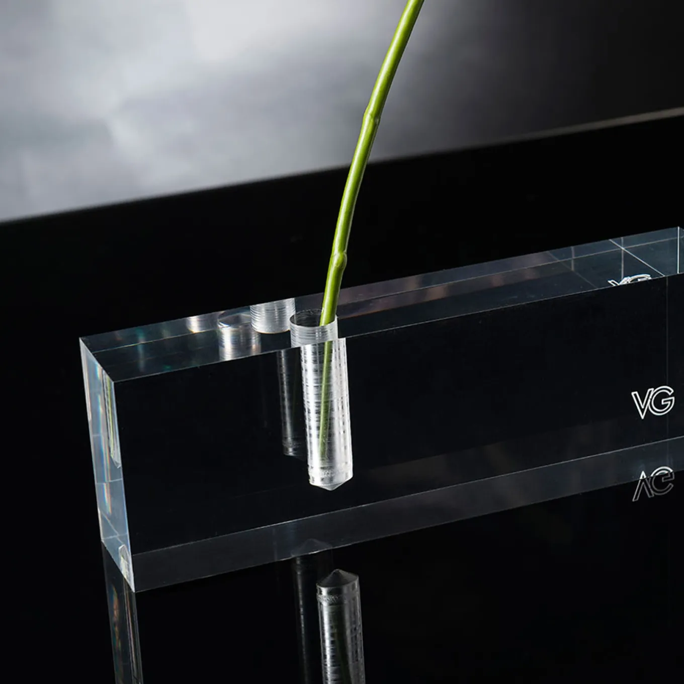 A sublime expression of clean and minimalist design, this small bud vase is defined by a rectangular shape enriched with a small but deep hole to hold the flower. An extraordinary showcase of refined elegance, it is entirely made of transparent plexiglass. Ideal for weddings and special events as well as home decor purposes.