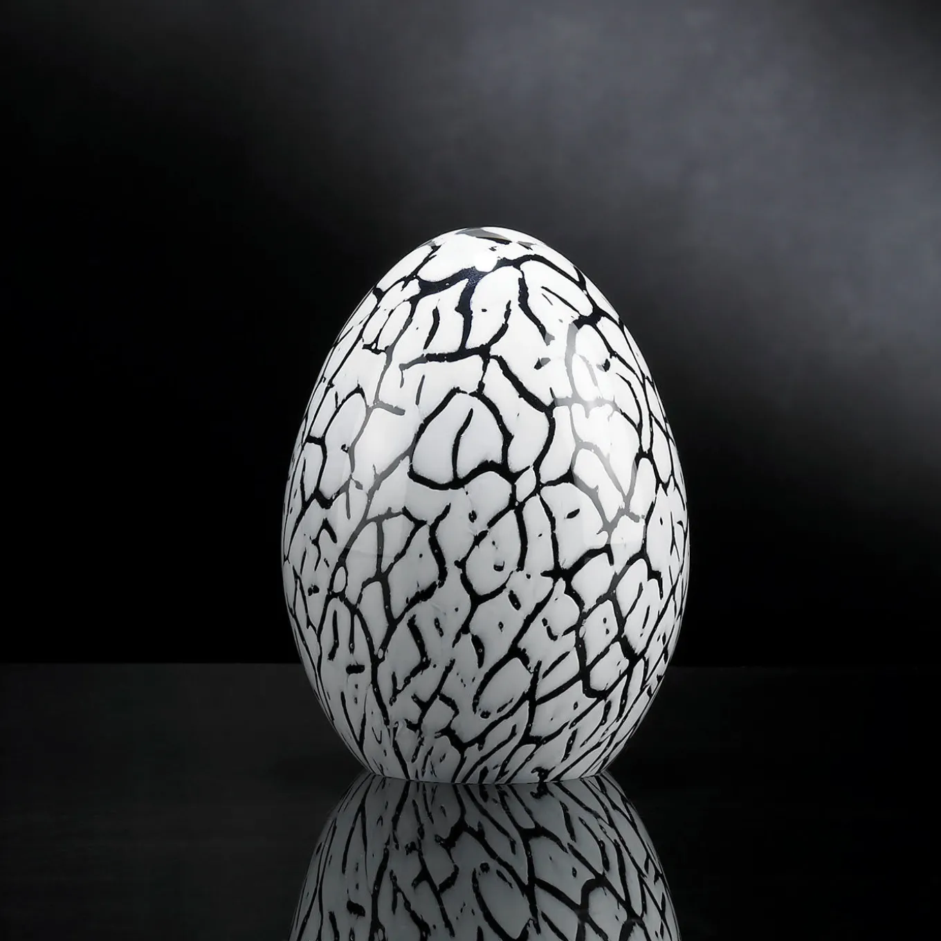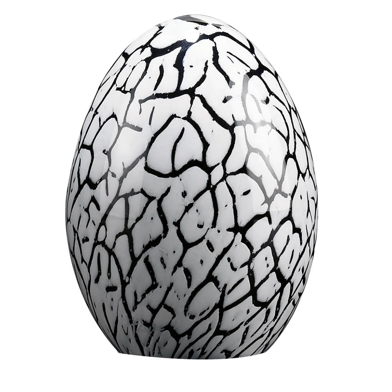 This small objet d’art will make a statement of its own when displayed on a refined console, coffee table, or sideboard, or even paired to the black piece of the same series for an accent of contrasting charm. Handcrafted of glass, it flaunts a dark white silhouette enhanced with black veins that reproduces the cracks of an eggshell.