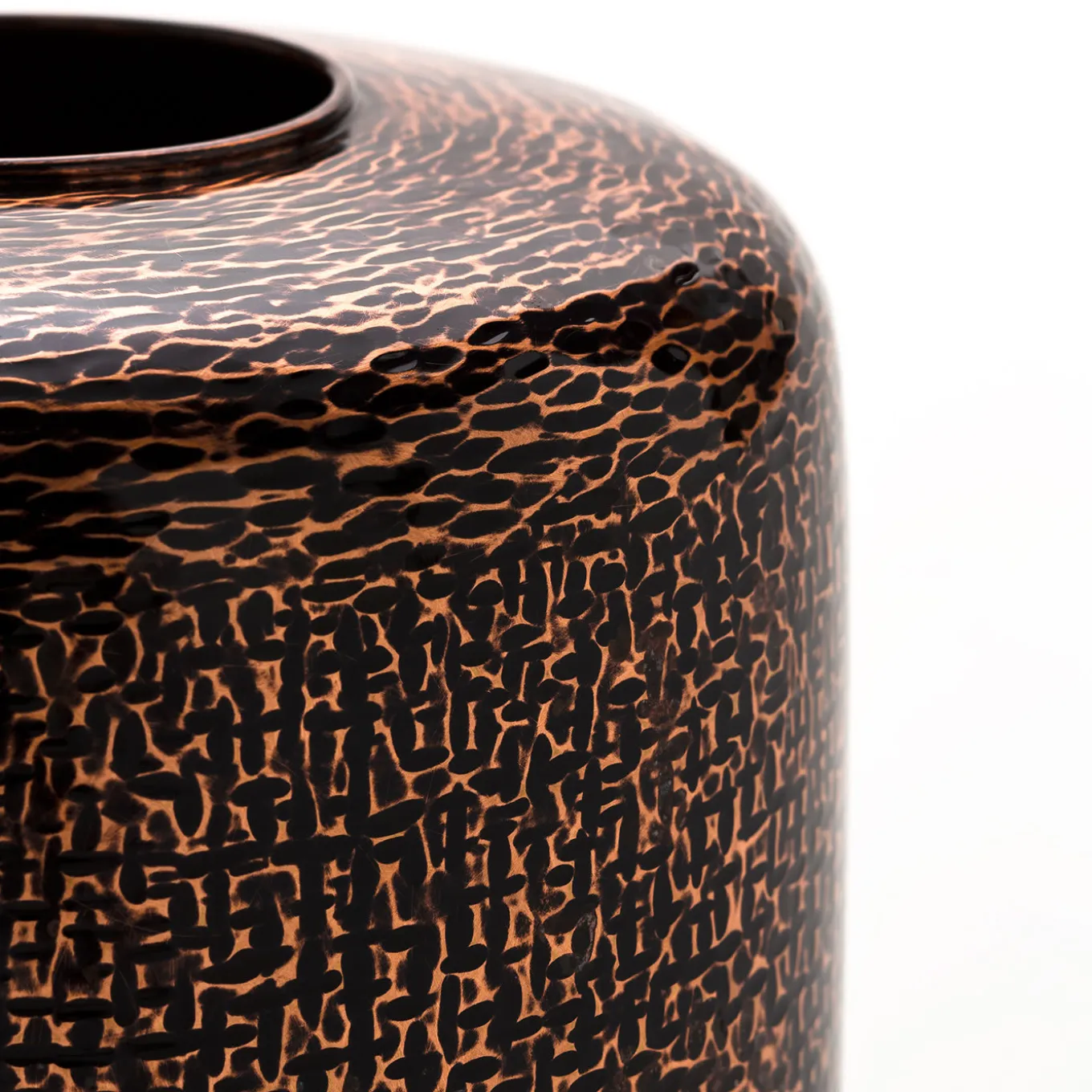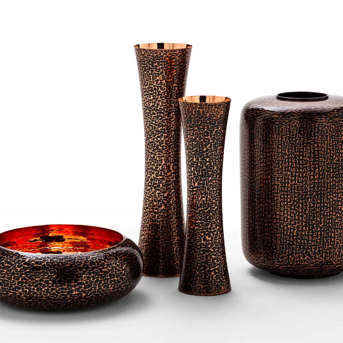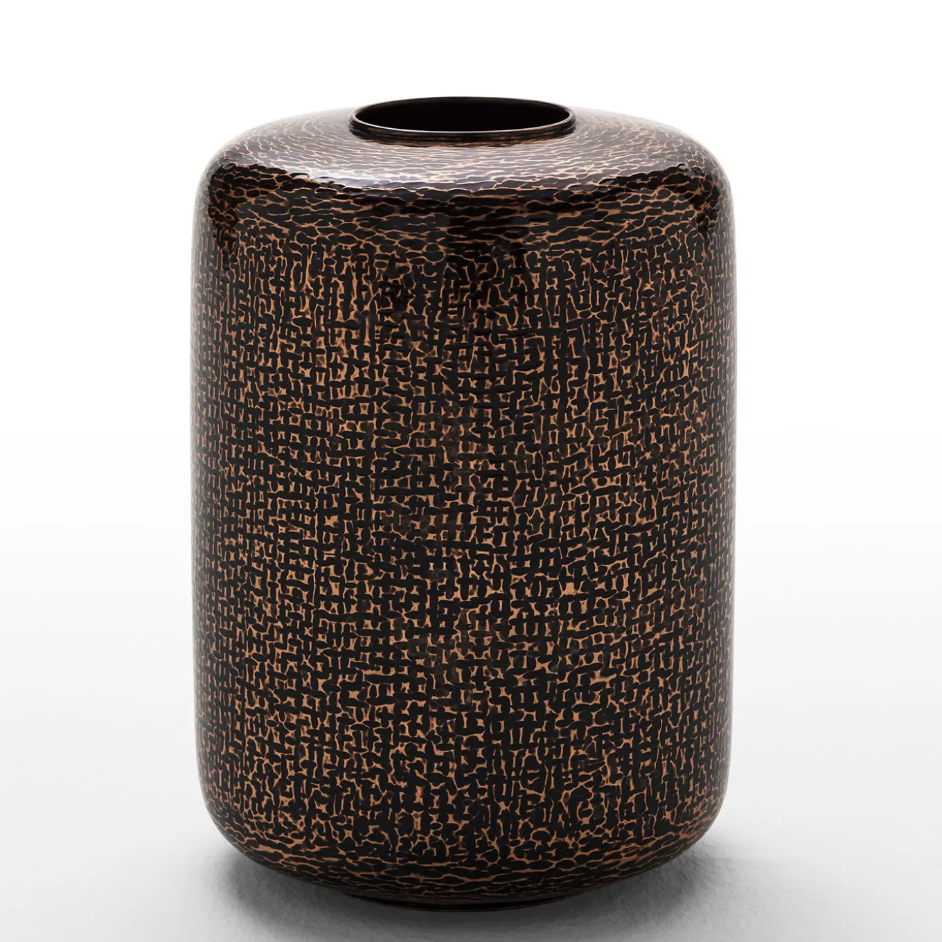 Named after its slim and straight silhouette, this exquisite vase features a cylindrical shape and an eye-catching motif created by the combination of copper and burnished varnish, that will imbue any interior with a gleaming allure.