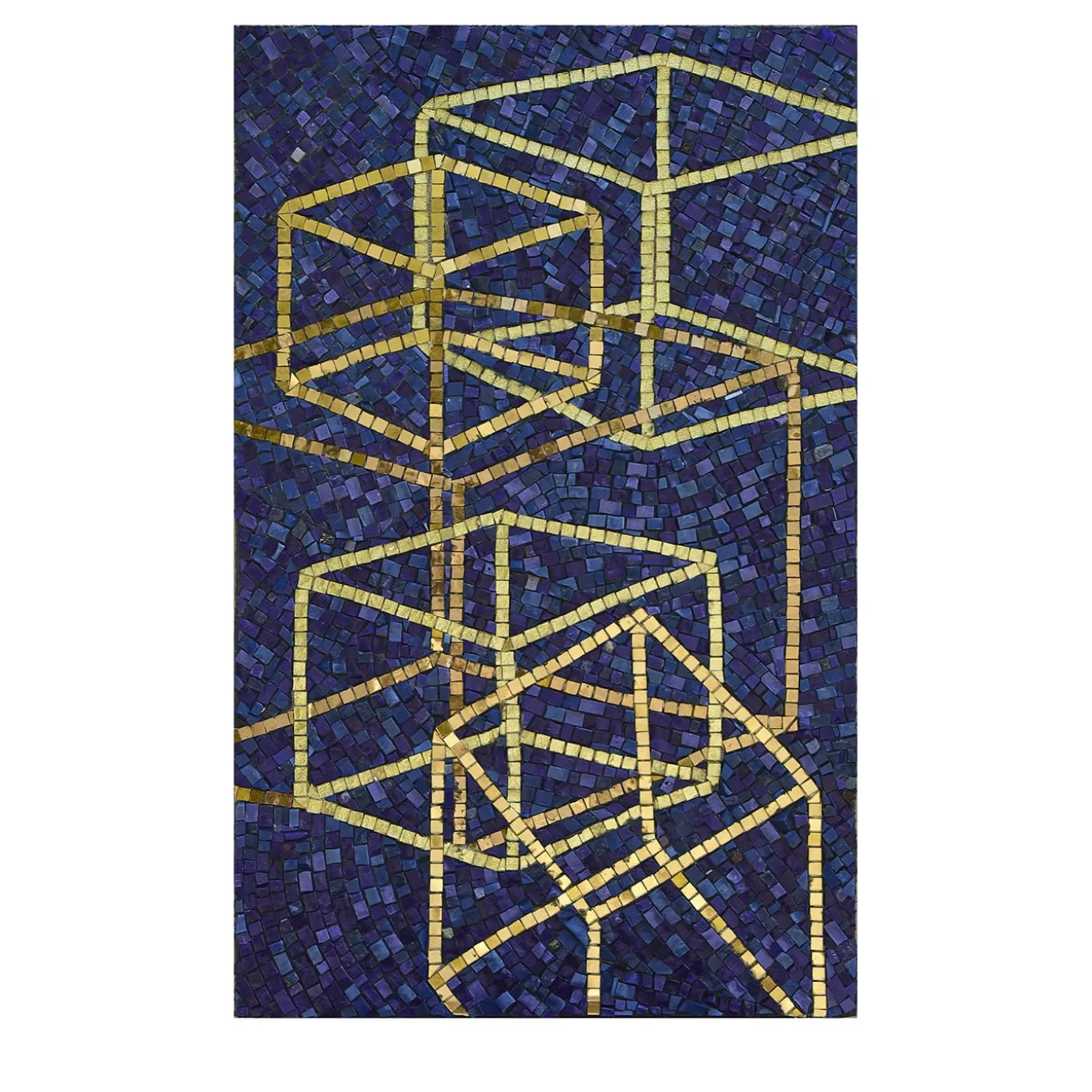 A mantle of deep-blue mosaic tiles is in this singular handmade panel the backdrop for a motif of cubes that mutually intersect. Showcasing a stunning golden hue, these figures celebrate the idea, conceived by Plato, that Earth’s building blocks were cubes. Geometric perfection is here reinvented through an entirely personal idea of harmony. An authenticity certificate is included.