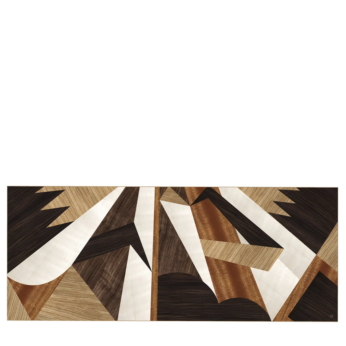 A geometry of harmonious lines created by prized wood inlays makes this wooden panel’s abstract pattern that will blend effortlessly into a modern interior. White maple, European oak, mahogany, European walnut and wengè woods are expertly carved and masterfully composed in a three-dimensional flux of angled shapes brimming with dynamic appeal. The name of this boiserie translates as “Above/Below” to symbolize a magic dimension where what is below and above interchange in an interplay of lights and shadows. Finishing: Mirror polished.