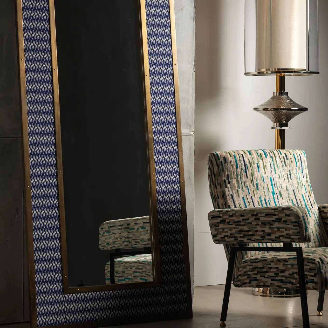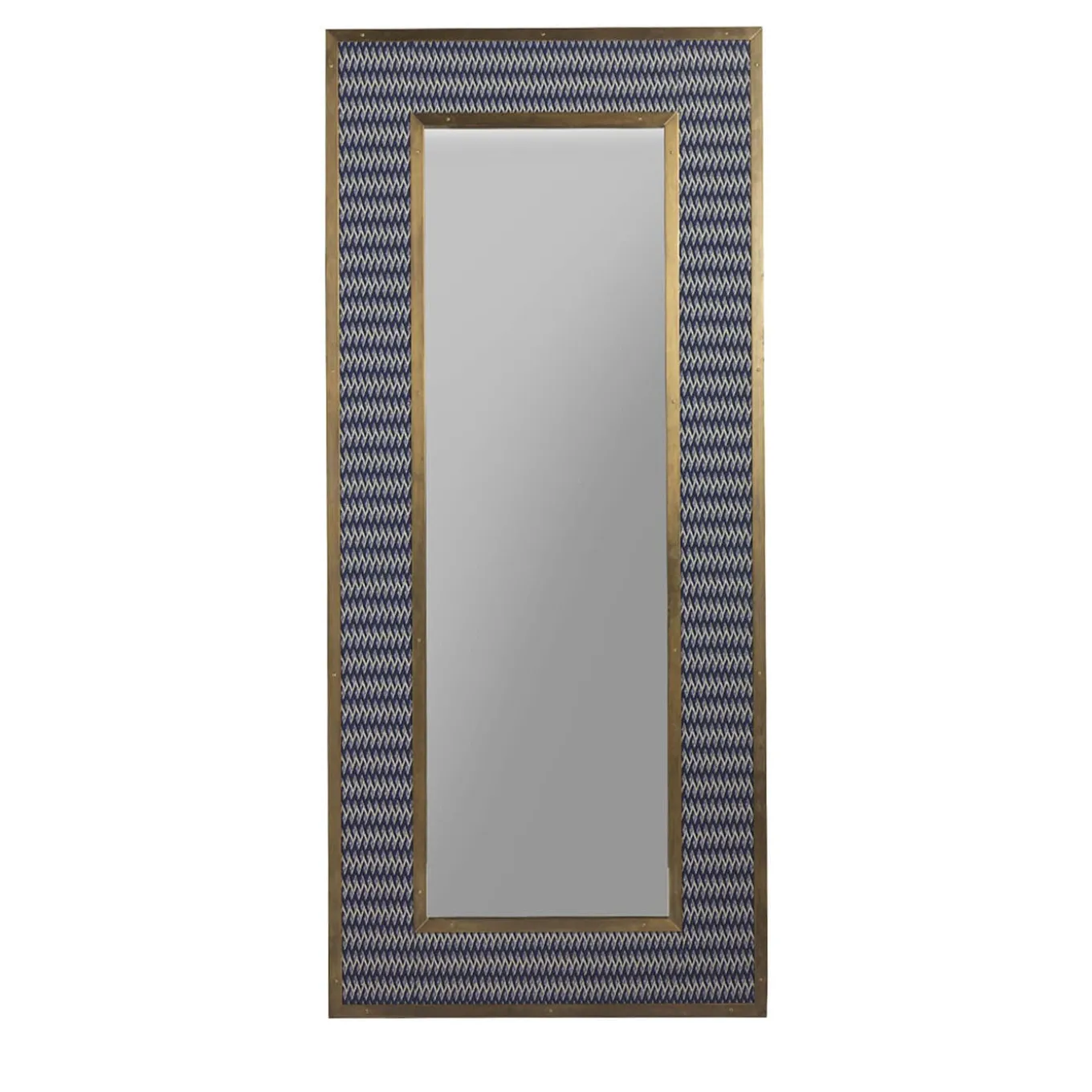 This stunning rectangular mirror is an exercise in elegant finishes and sartorial value. Outlined by bright natural-finished brass profiles, the frame flaunts a fine fabric upholstery that hypnotizes with its extensive zig-zagged pattern emerging from a yet reassuring blue-toned backdrop. The piece will make for a superb addition to vintage-inspired decors as well as modern ones.