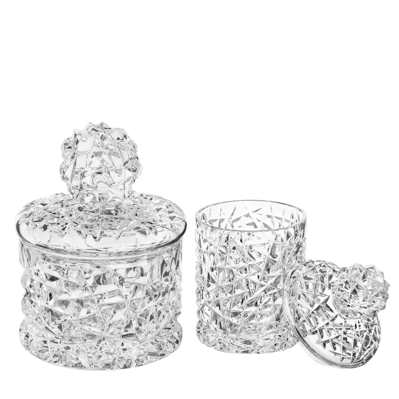 This stunning addition to any bathroom will make a statement in an elegant home, where the striking texture adorning the transparent glass of these two boxes will reflect the surrounding light. These two cylindrical pieces are topped with lids equipped with spherical handles. One is conceived as a baby powder receptacle (Ø 11.5 cm H 15 cm), the other is a bath salts container (Ø 11.5 cm H 20 cm). They can be sold separately.