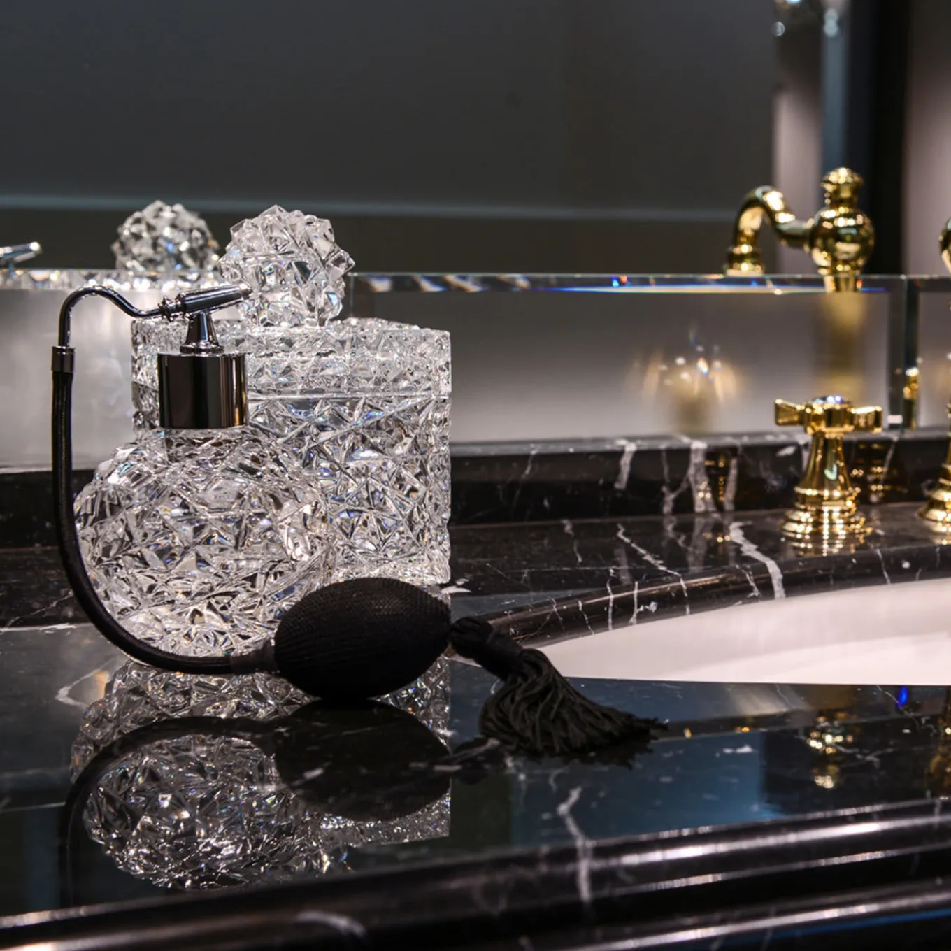 A superb complement to a sophisticated bathroom, this set of two square boxes was crafted of transparent glass. The external surface of both pieces is splendidly adorned with a striking texture that adds a dynamic and refined accent to the pieces, reflecting the surrounding light to create a luxurious ambiance. The tall box is meant to store cotton balls (H 16.5 cm), the short one is for q-tips (H13 cm). Part of the Spa Sinfonia, this set can be combined with the others in the same series for a cohesive look.