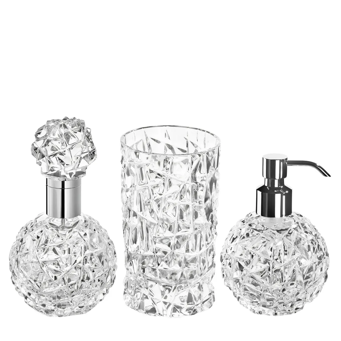 Part of the Spa Sinfonia collection, this set is a stunning addition to a powder room or bathroom, where the striking texture that adorns the transparent glass pieces will sparkle in the surrounding light, creating a luxurious ambiance. Either alone or combined with the other items in the series, this set will make a statement. It includes: a perfume bottle (W 10cm and H 19cm), a toothbrush holder (Ø 7.8cm and H 12cm), and a soap dispenser (H 15 cm).