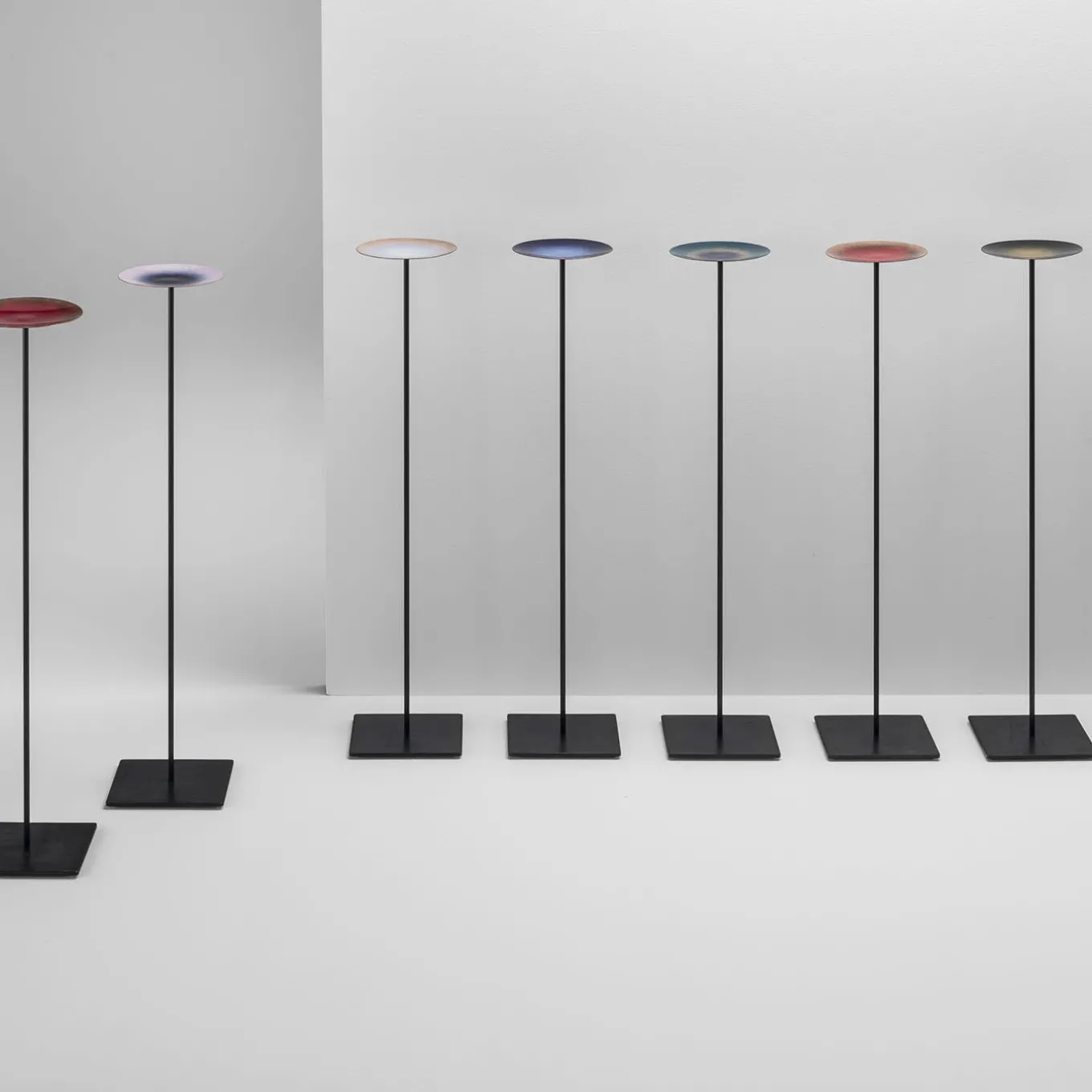 Decorative plates, placed on tall iron support, made of enameled copper, using a decorative technique that ensures striking coloration and brilliance. The technique was perfected by some Italian masters, such as Paolo de Poli, a craftsman active in Padua in the second half of the 20th century. The name of the collection recalls the Paduan Specola. The plates were made by Incalmi in collaboration with Giorgia Zanellato and Daniele Bortotto.