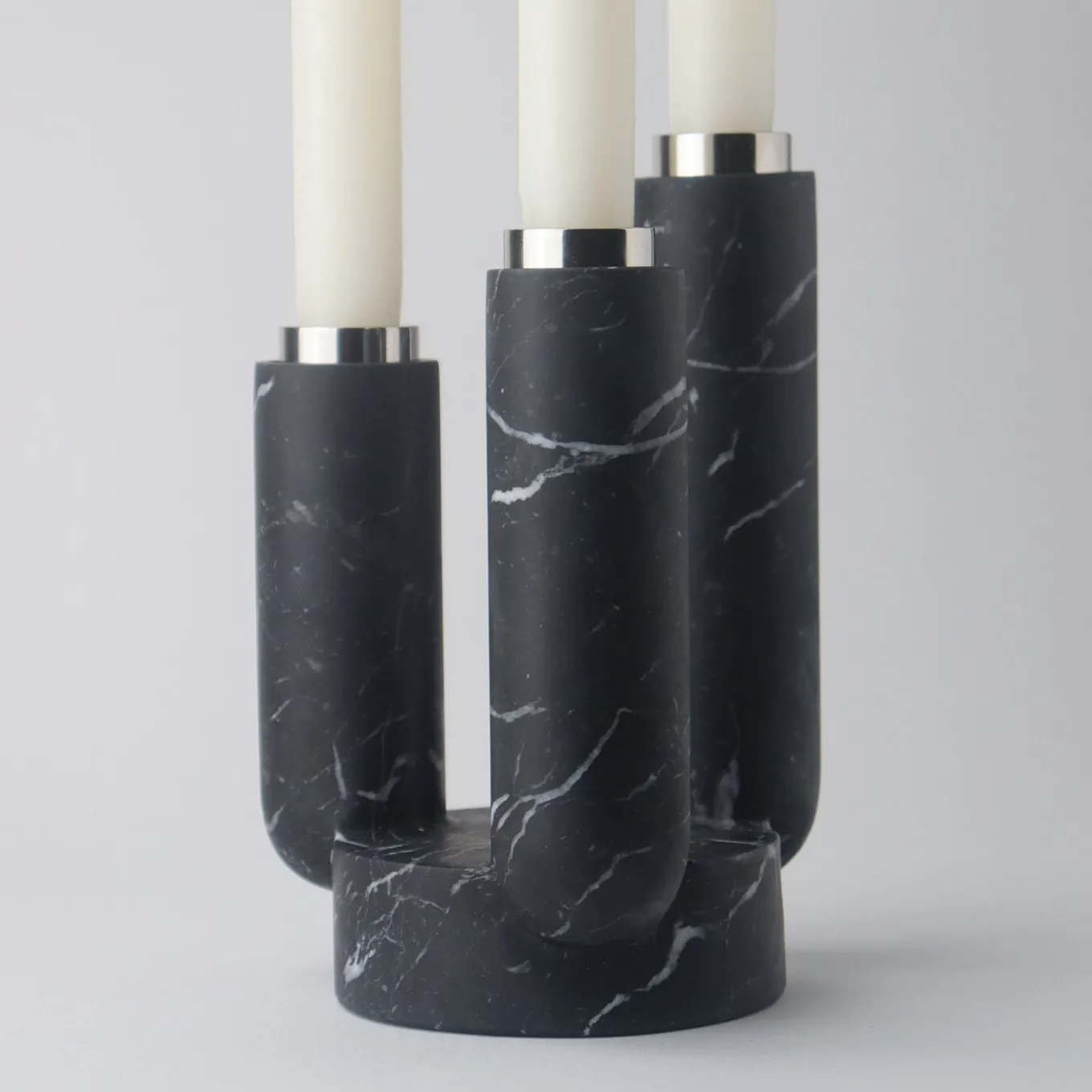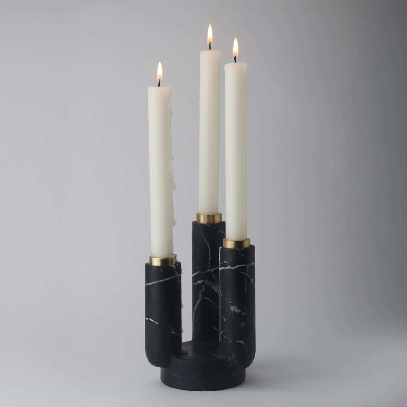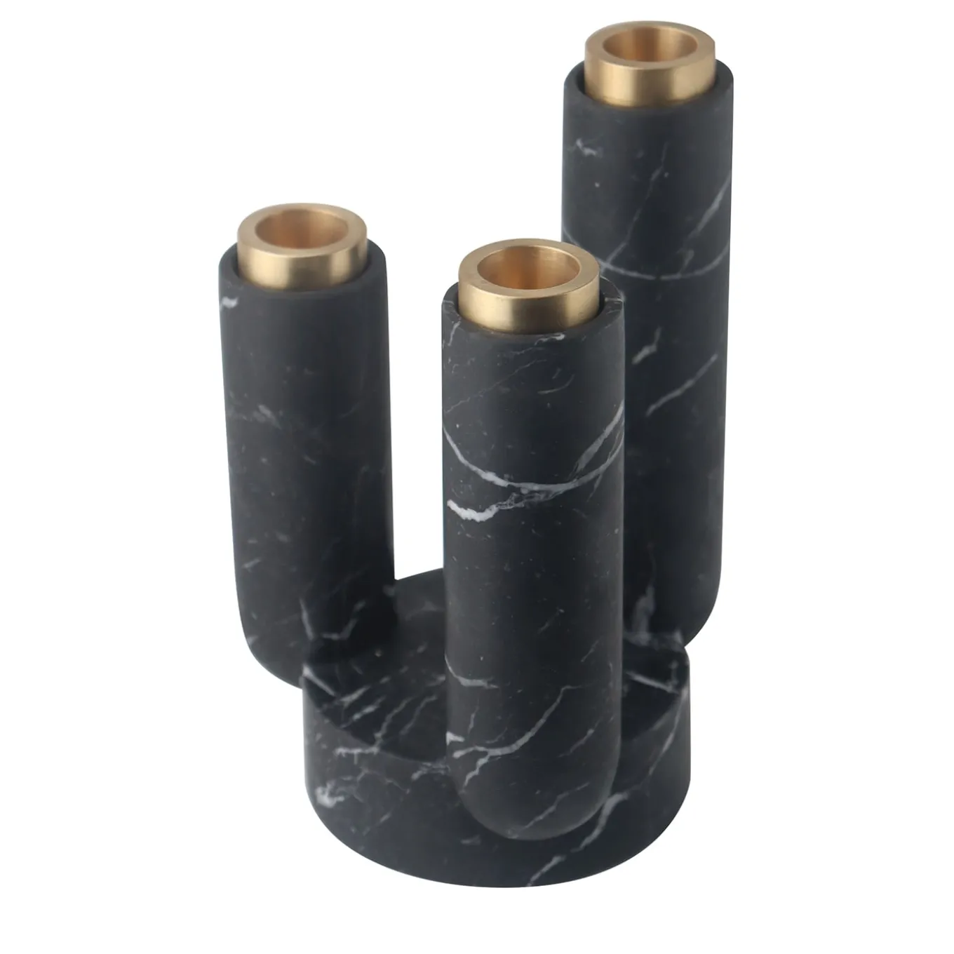 The Splendido candle holder in Black Marquinia marble is expertly carved from a single block of premium marble by skilled artisans. No separate pieces or gluing, just the beauty of nature and Italian craftsmanship at its finest. Enhanced with a brushed brass ring, this elegant piece exudes sophistication. Candles are not included. Also available in White Arabescato and Green Alpi marble. Please contact the Concierge for more information.