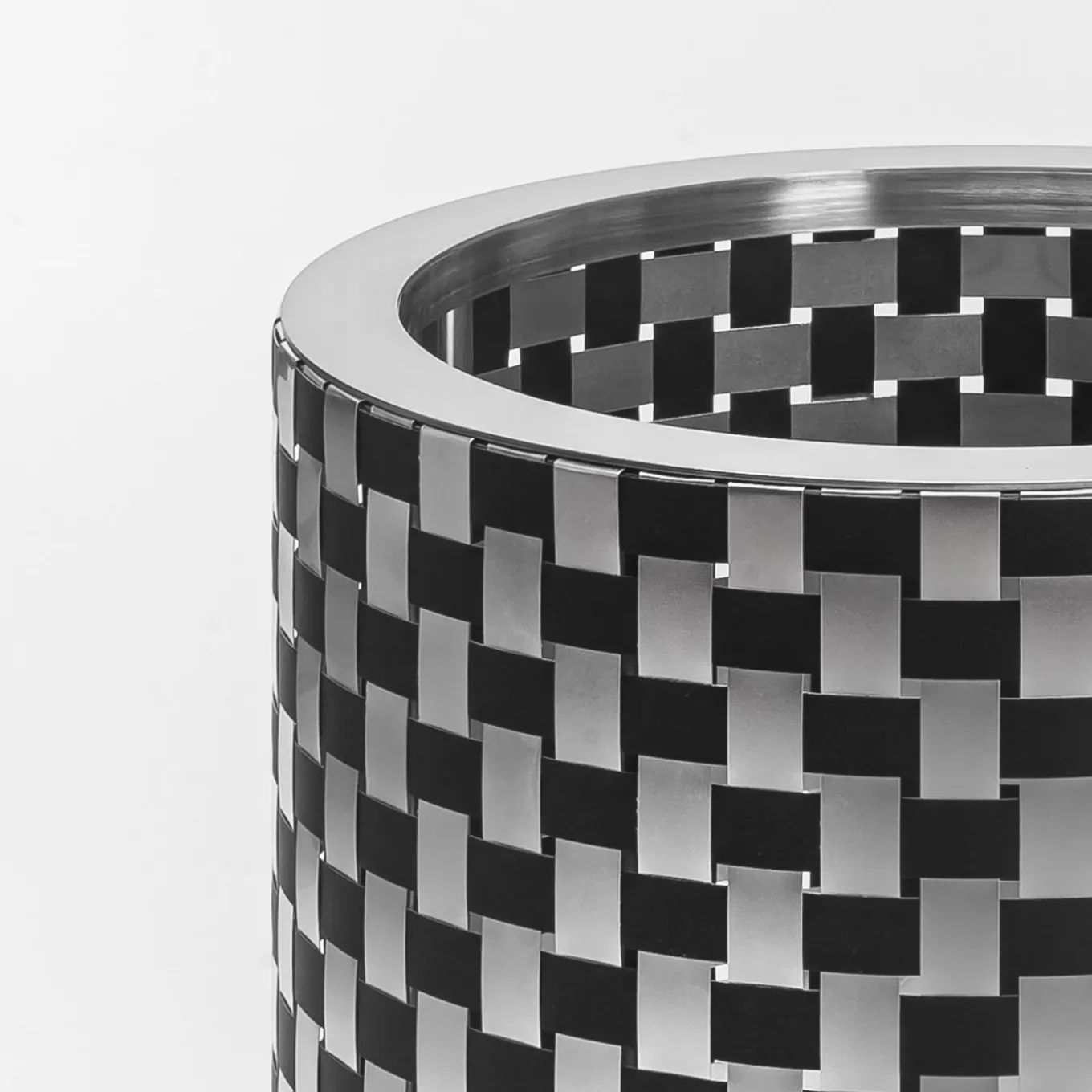 Inspired by the 1960s Optical Art style, this eye-catching cachepot gets its name from the handwoven, anodized aluminum material designed by Inthegarden Design Studio. Ideal for both indoor and outdoor use, this stylish optical effect and texture is created by the alternating interweaving of black and natural aluminum foils, that covers the steel-lined cylindrical shape.