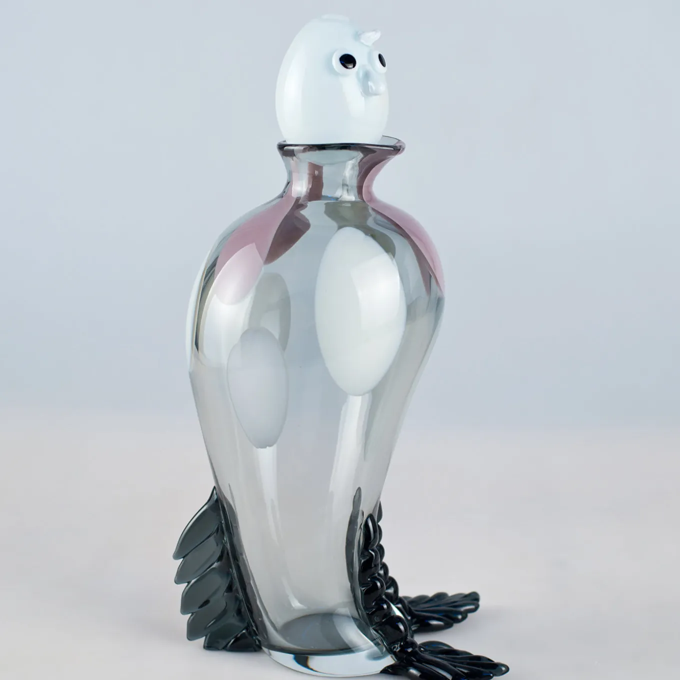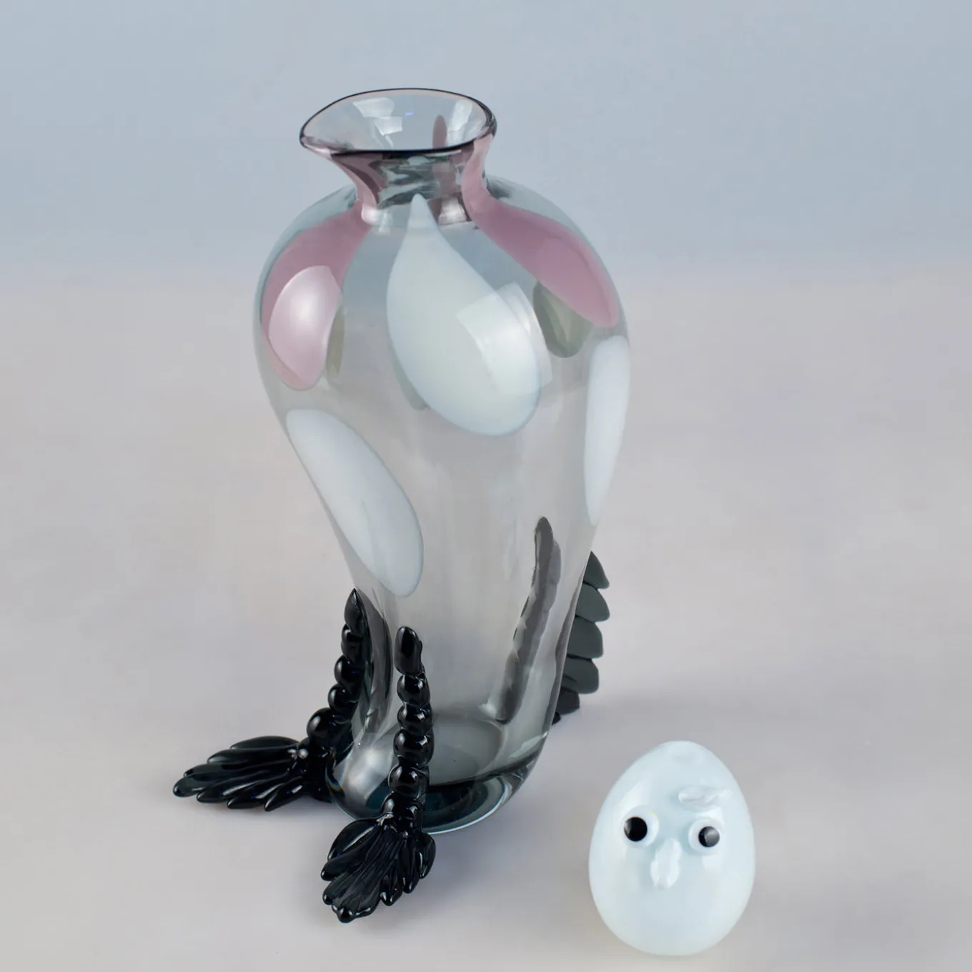 One piece of the Frères Pigeons duo, this glass sculpture of a pigeon is inspired by 1920’s Murano’s animal figurine trend. In transparent smoky glass with elegant white and pink spots, the piece sits on elegant feet cut from black glass. The vase is topped with a white head and a quizzical expression to make for a true collector’s piece.